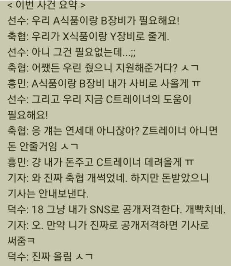 총정리하자면, 이번 사건에서 축협은 선수의 요구를 제대로 지원하지 못한 채 돈만 받은 것으로 보였다. 덕수는 이를 공개저격한다고 유감을 표했지만, 기자는 그럴 경우 기사로 다룰 것을 약속했다.