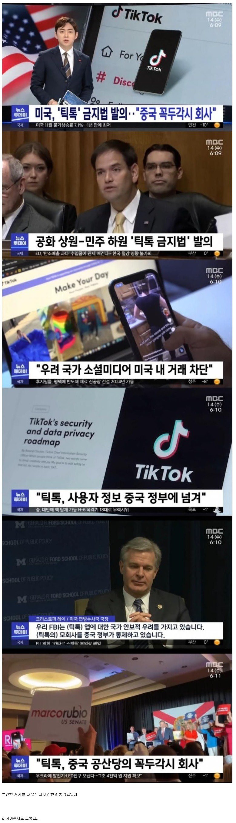 틱톡의 보안 및 데이터 프라이버시 로드맵에 대한 미국의 우려로 인해 '틱톡 금지법'이 발의되었다. 이에 따라 틱톡은 중국 꼭두각시 회사로 여겨지고 있으며, 미국은 중국 정부가 모회사를 통제하고 있다고 주장하고 있다. 이러한 우려로 인해 틱톡은 사용자 정보를 중국 정부에 넘기고 있다는 비난을 받고 있다. 또한 EU는 탄소배출 과다 수입품에 관세를 매길 예정이다. 이로 인해 한국 철강 산업에도 영향이 불가피할 것으로 예상된다. 한편, 후지필름은 평택에 반도체 재료 신공장을 건설하여 2024년에 가동할 예정이다. FBI는 틱톡 앱에 대한 국가 안보적 우려를 가지고 있으며, 우크라에는 발전기 LED 전구를 보낼 예정이다. 이 외에도 다양한 국제 뉴스들이 소개되고 있다.