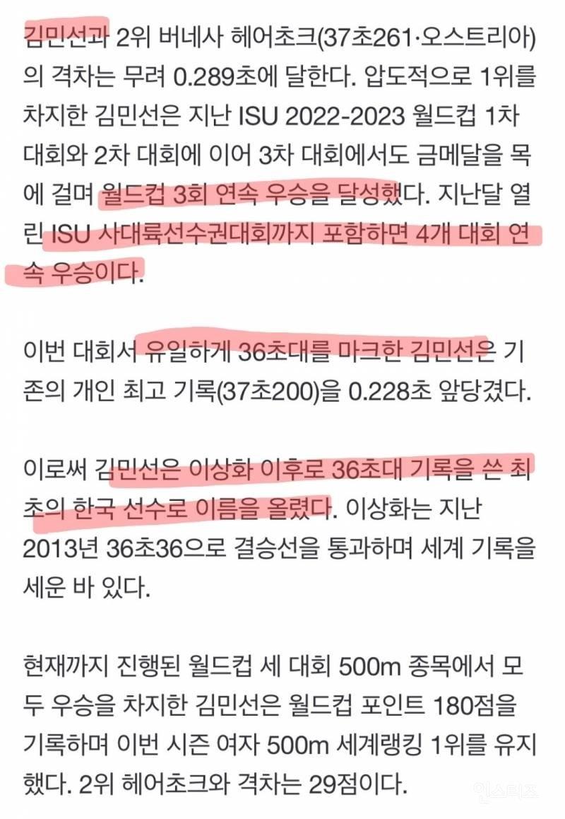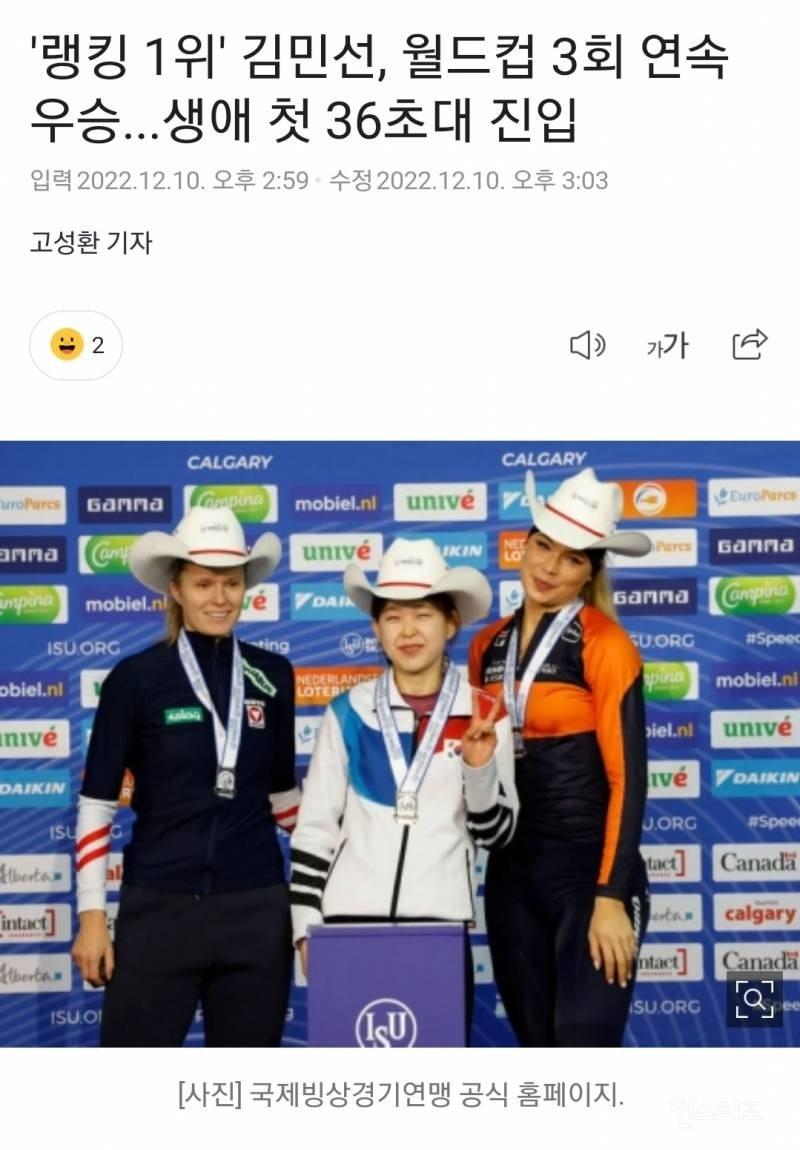 김민선이 랭킹 1위로 월드컵 3회 연속 우승을 차지했다. 생애 첫 36초대 진입을 기록하며 2022년 12월 10일 오후 2시 59분에 기록을 세우고, 3분 후인 오후 3시 3분에 수정되었다. 국제빙상경기연맹 공식 홈페이지에서 확인할 수 있다. 김민선의 압도적인 1위와는 달리, 2위인 버네사 헤어초크와의 격차는 0.289초였다. 김민선은 2022-2023 월드컵 1차 대회부터 3차 대회까지 모두 우승하며 월드컵 3회 연속 우승을 달성했다. 이에 이번 대회에서는 유일하게 36초대를 달성하며 개인 최고 기록을 갱신했다. 예전에는 이상화가 36초대 기록을 세웠지만, 김민선이 그 기록을 넘겼다. 김민선은 월드컵 세 대회 동안 500m 종목에서 우승을 차지하며 월드컵 포인트 1위를 차지했다.