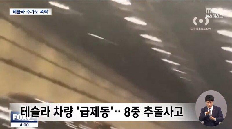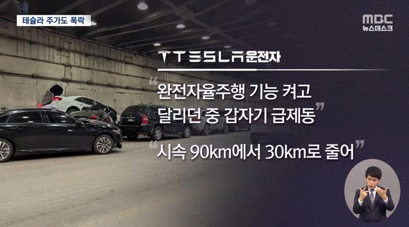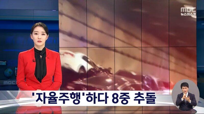 테슬라 차량이 완전 자율주행 기능을 사용하며 주행 중에 8대의 차량과 추돌하였다. 이 사고로 테슬라 주가도 폭락했다. 테슬라 차량은 급작스럽게 속도를 줄여 시속 90km에서 30km로 감속했다. 이 사고는 새벽 4시에 발생했으며, 이에 따라 테슬라 주가도 하락했다. MBC 뉴스데스크에 따르면 주행 중인 테슬라 차량의 완전 자율주행 기능이 갑자기 작동되어 추돌사고가 발생했다고 전해졌다.