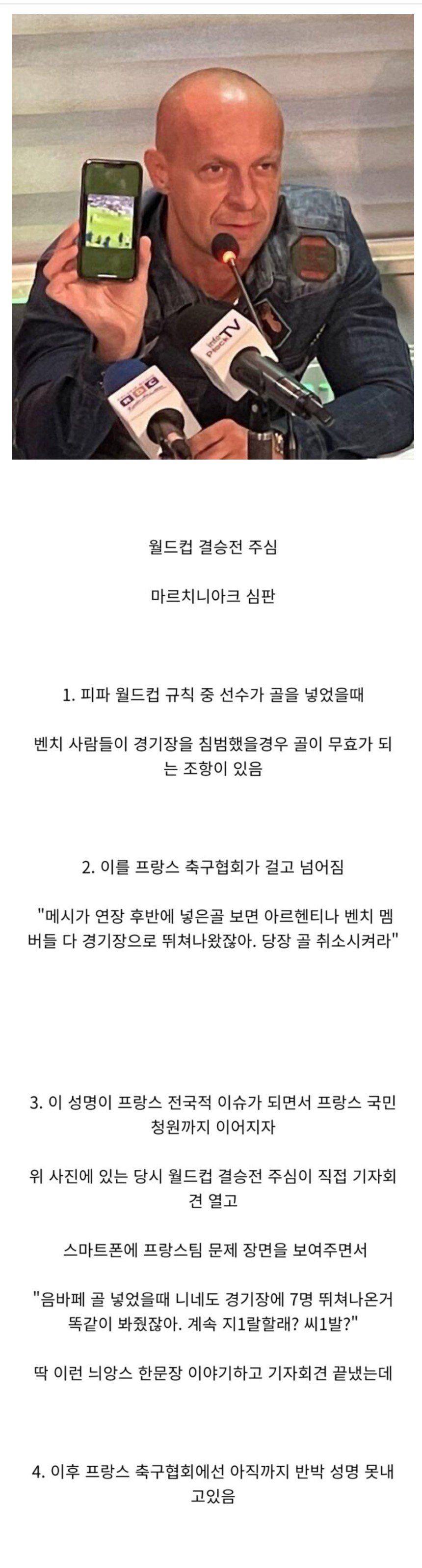 피파 월드컵 결승전에서 주심을 맡은 마르치니아크 심판은 규칙에 따라 선수가 골을 넣었을 때 벤치사람들이 경기장을 침범할 경우 골이 무효가 되는 조항이 있다는 사실을 알려주었다. 이에 프랑스 축구협회가 이를 이용해 아르헨티나의 벤치멤버들이 경기장으로 뛰치고 골을 넣은 메시의 골을 취소시키도록 요구했다. 이 성명은 프랑스 전국적인 이슈가 되었고, 프랑스 국민들도 청원을 진행했다. 사진 속의 주심이 기자회견에서 스마트폰으로 프랑스팀의 문제 장면을 보여주며 "이런 상황에서도 너희들이 경기장을 침범한 7명을 봐줬잖아. 계속해서 비난할 생각이냐? 정말 이런 짓을 하다니!"라고 입장을 밝혔다. 그러나 아직 프랑스 축구협회는 이에 대한 반박 성명을 발표하지 못하고 있다.