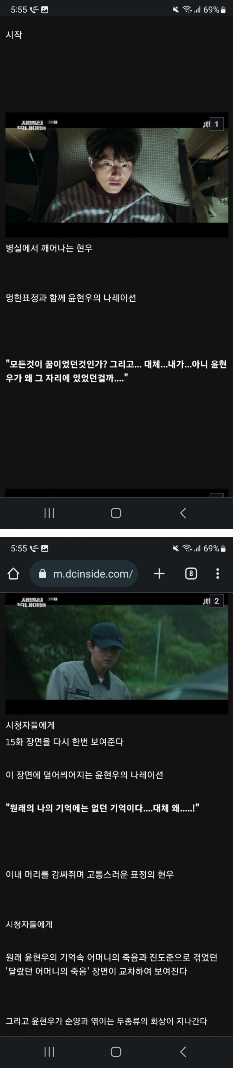 현우가 병실에서 깨어나며 혼란스럽고 멍한 표정을 지어 있다. 윤현우의 나레이션과 함께 현우는 막내아들인 윤현우로 깨어나게 되었음을 깨닫는다. 이에 현우는 시청자들에게 15화 장면을 보여주며 "이 모든 것이 꿈이었던 것일까? 그리고 왜 내가 아니라 윤현우가 그 자리에 있었던 걸까?"라고 말한다. 현우는 이 기억이 원래의 기억에는 없던 것이라고 덧붙이며 고통스러운 표정으로 머리를 감싸쥐고 있다.