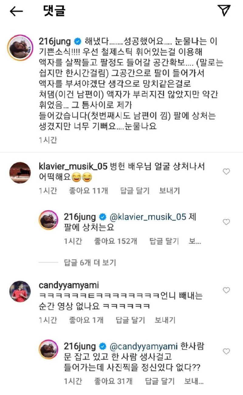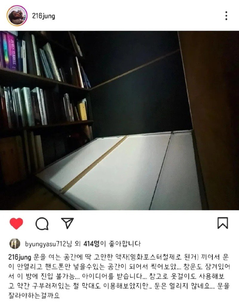 글을 정리해보자면, byungyasu712님이 올린 글에 따르면 어떤 방에는 문을 열 수 없고, 창문도 잠겨있어서 진입할 수 없다고 합니다. 글쓴이는 문을 열기 위해 다양한 아이디어를 시도하였지만, 여전히 문은 열리지 않습니다. 다른 사용자들은 글쓴이에게 도움을 주기 위해 댓글을 남기며, 문을 잘라야하는지, 참깨를 이용해야하는지 등 다양한 조언을 해줍니다. 글쓴이는 고민에 빠져 내일로 미루는 것이 좋다는 의견도 받았고, 문을 잘라야 한다는 의견도 있습니다. 그러나 글쓴이는 문을 자르지 않고 액자를 이용해 문을 부순 후에 진입할 수 있었다고 합니다. 216jung 님은 이러한 결과에 대해 기뻐하며, 다른 사용자들로부터도 칭찬과 응원을 받습니다. 그러나 다른 사용자들은 액자를 부실 때 얼굴에 상처가 나지 않았는지 걱정을 표하며, 글쓴이는 1차 시도에서는 상처가 나지 않았다고 답글을 달았습니다. 이렇게요.