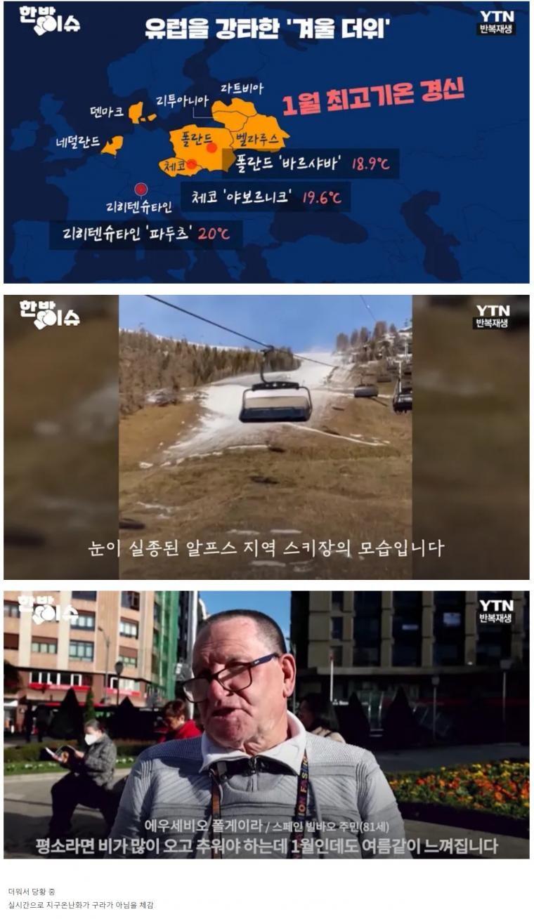 최근 유럽을 강타한 '겨울 더위' 현상이 이어지고 있습니다. 네덜란드, 덴마크, 리투아니아, 폴란드, 체코 등 여러 나라에서 기록적인 더위를 겪고 있습니다. 이런 기상 현상을 통해 실시간으로 지구온난화의 영향을 체감하고 있는 것으로 보입니다. 특히 리히텐슈타인의 '파두츠'는 1월에도 최고기온 20도를 기록하며 이전 기록을 경신하였고, 벨라루스의 '바르샤바'와 체코의 '야보르니크'도 18.9도와 19.6도의 고온을 기록하였습니다. 이에 따라 눈이 실종된 알프스 지역 스키장에서도 겨울 분위기를 만끽하기 힘들어진 모습입니다. 이 현상에 대해 유럽 각지에서 주민들은 당황하고 있으며, 스페인 빌바오 지역 주민인 폴게이라씨(81세)는 평소에는 1월에 비가 많이 와서 추워야 하는데, 이번에는 여름 같은 느낌이 든다고 말하고 있습니다.