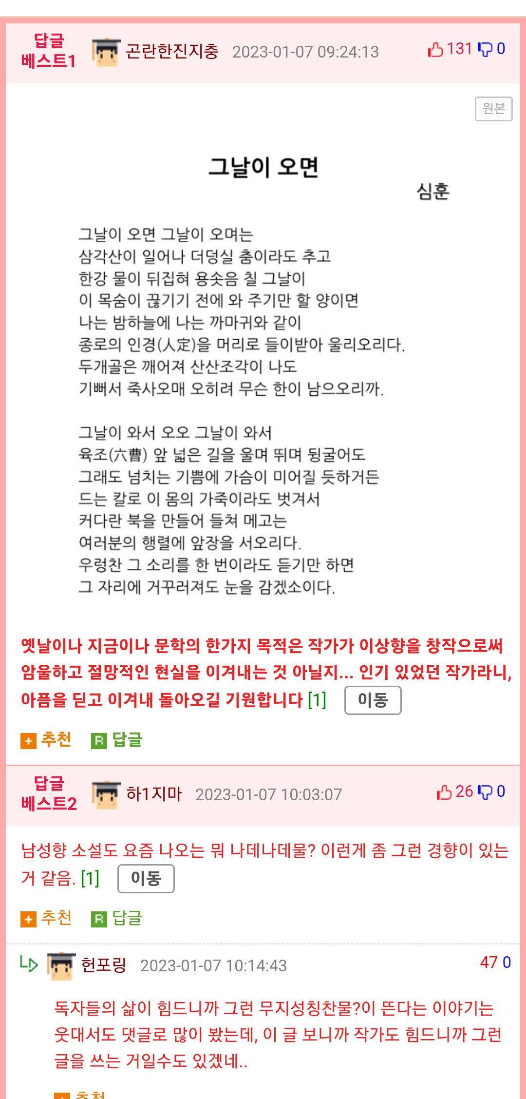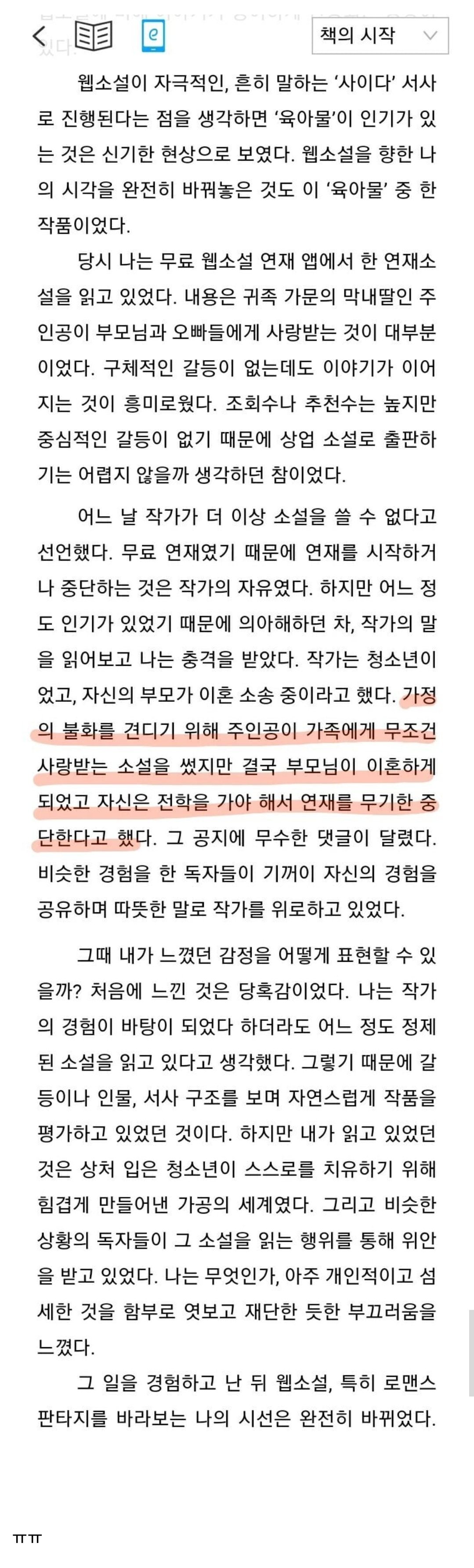 어느 날 작가가 소설을 계속 쓸 수 없다고 선언했다. 연재는 작가의 자유였지만, 인기있었기 때문에 이에 대해 의아했다. 작가의 선언에 충격받았다. 작가는 청소년이었고, 부모가 이혼 소송 중이었다. 주인공이 가족에게 무조건 사랑받는 이야기를 썼지만 결국 부모님이 이혼하게 되고 자신은 전학을 가야 해서 연재를 중단한다고 했다. 그 공지에는 많은 댓글이 달렸다. 비슷한 경험을 한 독자들이 작가를 위로하며 자신의 경험을 공유했다.