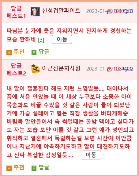 유튜버인 나는 주차장에서 아빠에게 장난스럽게 "내가 결혼하니까 심정이 어때?"라고 물었더니 의외의 답이 나왔다. 그 답은 베스트 베스라고 할 수 있는 답변이었다. 아빠는 와앰아쿠라잉...ㅠ 따님분 모습과 추천 답글이 베스트로 떴다. 첫 번째 답글은 "어떤 인연으로 우리가 세상에 만나게 됐는지는 몰라도, 우리의 인연은 무짠지 어떤 이치로 결합되어 있는 것 같아. 서운하기도 하고 개운하기도 해, 우리 딸이 다 커서 결혼하는 거 보니까 아빠가 도리가 조금 미흡했을지라도 어릴 때부터 너를 키우면서 행복했어. 한 짐을 던진 것 같기도 해 (경제적으로) 잘 사라는 말은 안 해도, 모든 사람이 다 행복하고 즐겁게 살 수는 없지만 행복하게 즐겁게 사는 게 중요해. 그래도 내 딸은 행복하게 살아라"라는 내용이었다.