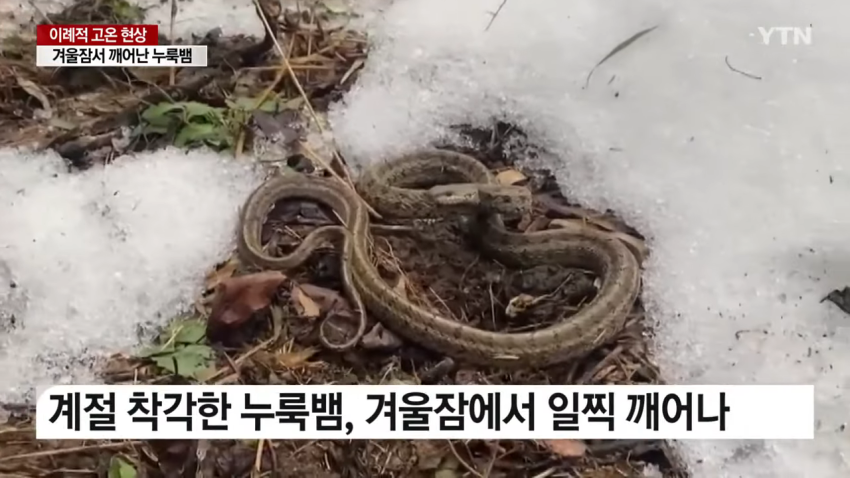 누룩뱀이 겨울잠에서 깨어났다는 소식이 전해졌다. 이들은 실수로 봄이 온 줄 알고 깨어난 것으로 보인다. 하지만 밤부터 겨울 호우가 쏟아지면서 이 독특한 현상은 더욱 주목을 받았다. YTN에 따르면, 이례적인 고온 현상으로 누룩뱀들은 봄 날씨를 착각해서 이전보다 일찍 깨어난 것으로 추정된다. 전국 곳곳에서 이로 인해 이례적인 사건들이 발생하고 있으며, 이용욱 변산반도국립공원사무소 자원보전팀장은 자신이 순찰하던 도중 탐방로 옆 대나무숲 근처에서 이 현상을 목격하였다. 그는 "겨울에 뱀이 나오는 것은 이례적인 일이기 때문에 제가 확인해 보았습니다"라고 전했다. 이로 인해 앞으로의 날씨 변화에 대한 더 많은 관심이 기울어지고 있는 상황이다.