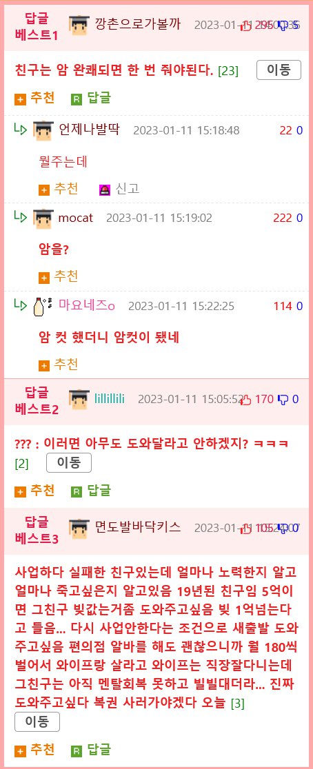 복권 5억 당첨자의 소감.jpg 아시가루 쪽지보내기자기소개아이디로 검색전체게시물 01-14 5,385 회 0 건 훈훈하다.. 5억원에 당첨된 즉석복권 1등 당첨자가 병원비를 친구에게 내줄 것이라고 밝혔다. A씨는 친구가 암에 걸려 치료를 받고 있으며, 이미 친구를 도와준 적이 있었다고 전했다. 그리고 이러한 행운이 친구를 돕기 위한 것이라고 말했다. 친구의 완쾌 이후에 한 번 지원할 예정이다. 목록 이메일 주소는 공개되지 않습니다. 댓글 * 이름 * 비밀번호 * 비밀글 사용 제목 글쓴이 조회 날짜 어느 자전거 유튜버 다리 절단 당시 글과 근황.blog 도레미 쪽지보내기자기소개아이디로 검색전체게시물 6,345 0 23-01-17 도레미 쪽지보내기자기소개아이디로 검색전체게시물 6,345 23-01-17 연애를 안하는 이유가 뭐니? 모카크림 쪽지보내기자기소개아이디로 검색전체게시물 7,034 0 23-01-16 모카크림 쪽지보내기자기소개아이디로 검색전체게시물 7,034 23-01-16 강호동이 연예인 섭외하는 방법 몽비쥬 쪽지보내기자기소개아이디로 검색전체게시물 5,743 0 23-01-16 몽비쥬 쪽지보내기자기소개아이디로 검색전체게시물 5,743 23-01-16 이시영 안전불감증 논란 아시가루 쪽지보내기자기소개아이디로 검색전체게시물 5,428 0 23-01-16 아시가루 쪽지보내기자기소개아이디로 검색전체게시물 5,428 23-01-16 수능영어식 카톡.jpg 도레미 쪽지보내기자기소개아이디로 검색전체게시물 5,964 0 23-01-15 도레미 쪽지보내기자기소개아이디로 검색전체게시물 5,964 23-01-15 얼마전 부산 주차 타워 화재 발화지점 조사 결과 지니까꿍 쪽지보내기자기소개아이디로 검색전체게시물 5,306 0 23-01-15 지니까꿍 쪽지보내기자기소개아이디로 검색전체게시물 5,306 23-01-15 분위기 한방에 뒤집어 버린 한국인 몽비쥬 쪽지보내기자기소개아이디로 검색전체게시물 5,143 0 23-01-15 몽비쥬 쪽지보내기자기소개아이디로 검색전체게시물 5,143 23-01-15 ⭐ 복권 5억 당첨자의 소감.jpg 아시가루 쪽지보내기자기소개아이디로 검색전체게시물 5,386 0 23-01-14 아시가루 쪽지보내기자기소개아이디로 검색전체게시물 5,386 23-01-14 한 겨울에 뱀이 동면에서 깨어났군요. ㄷㄷㄷㄷ 아시가루 쪽지보내기자기소개아이디로 검색전체게시물 5,793 0 23-01-14 아시가루 쪽지보내기자기소개아이디로 검색전체게시물 5,793 23-01-14 야구선수 이대호 집.jpg 도레미 쪽지보내기자기소개아이디로 검색전체게시물 5,684 0 23-01-13 도레미 쪽지보내기자기소개아이디로 검색전체게시물 5,684 23-01-13 최근 부동산 근황 동태탕 쪽지보내기자기소개아이디로 검색전체게시물 6,097 0 23-01-13 동태탕 쪽지보내기자기소개아이디로 검색전체게시물 6,097 23-01-13 맥주 들고 서 있다가 대박 난 남자 얼음사이다 쪽지보내기자기소개아이디로 검색전체게시물 6,531 0 23-01-13 얼음사이다 쪽지보내기자기소개아이디로 검색전체게시물 6,531 23-01-13 28살이 엄마한테 쳐맞은 이유.JPG 달콤별 쪽지보내기자기소개아이디로 검색전체게시물 6,378 0 23-01-12 달콤별 쪽지보내기자기소개아이디로 검색전체게시물 6,378 23-01-12 이혼 12년만에 연락한 딸의 답장... 너넨 어떨것 같아? 얼음사이다 쪽지보내기자기소개아이디로 검색전체게시물 6,409 0 23-01-12 얼음사이다 쪽지보내기자기소개아이디로 검색전체게시물 6,409 23-01-12 MS, 3초 길이 샘플만으로 음성 복제할 수 있는 AI VALL-E 소개 몽비쥬 쪽지보내기자기소개아이디로 검색전체게시물 5,785 0 23-01-11 몽비쥬 쪽지보내기자기소개아이디로 검색전체게시물 5,785 23-01-11 내가 결혼하니 심정이 어때? 얼음사이다 쪽지보내기자기소개아이디로 검색전체게시물 6,180 0 23-01-11 얼음사이다 쪽지보내기자기소개아이디로 검색전체게시물 6,180 23-01-11 나무 깎는 노인 옆집총각 쪽지보내기자기소개아이디로 검색전체게시물 5,598 0 23-01-11 옆집총각 쪽지보내기자기소개아이디로 검색전체게시물 5,598 23-01-11 요즘 매운 라면 근황.jpg 밝은횃불 쪽지보내기자기소개아이디로 검색전체게시물 6,480 0 23-01-10 밝은횃불 쪽지보내기자기소개아이디로 검색전체게시물 6,480 23-01-10 성수동 테슬라 화재 사건 몽비쥬 쪽지보내기자기소개아이디로 검색전체게시물 6,493 0 23-01-10 몽비쥬 쪽지보내기자기소개아이디로 검색전체게시물 6,493 23-01-10 부도 위기를 맞은 어느 CEO의 결단 얼음사이다 쪽지보내기자기소개아이디로 검색전체게시물 6,013 0 23-01-10 얼음사이다 쪽지보내기자기소개아이디로 검색전체게시물 6,013 23-01-10 19?) 소에 대한 뒤틀린 궁금증.jpg 밝은횃불 쪽지보내기자기소개아이디로 검색전체게시물 6,015 0 23-01-09 밝은횃불 쪽지보내기자기소개아이디로 검색전체게시물 6,015 23-01-09 웹소설 작가가 연재를 중단한 이유.jpg 지니까꿍 쪽지보내기자기소개아이디로 검색전체게시물 6,153 0 23-01-09 지니까꿍 쪽지보내기자기소개아이디로 검색전체게시물 6,153 23-01-09 세상에 하나 뿐인 LEGO 명함 밝은횃불 쪽지보내기자기소개아이디로 검색전체게시물 6,945 0 23-01-09 밝은횃불 쪽지보내기자기소개아이디로 검색전체게시물 6,945 23-01-09 호주 워홀의 성공적인 사례 몽비쥬 쪽지보내기자기소개아이디로 검색전체게시물 5,790 0 23-01-09 몽비쥬 쪽지보내기자기소개아이디로 검