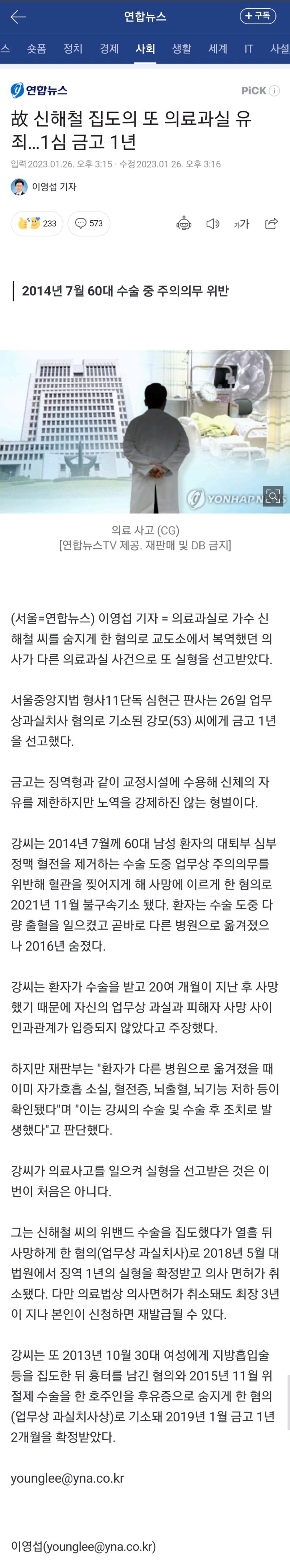 취소된 위로 내려놨다. 이번에 의료과실로 1년의 실형을 선고받았다. 강씨는 2014년에도 신해철 씨의 위반드 수술을 집도해 열흘 뒤에 사망하도록 만든 혐의로 징역 1년의 실형을 받았던 바 있다. 이번 사건에서도 강씨는 자신의 업무상 과실과 피해자 사망 사이의 인과관계를 부정했지만, 재판부는 환자가 다른 병원으로 옮겨졌을 때 이미 강씨의 수술과 수술 후 조치와 관련된 문제가 확인되었다고 판단했다. 이번 사건은 강씨가 의료사고로 실형을 선고받은 두 번째 사례이다.