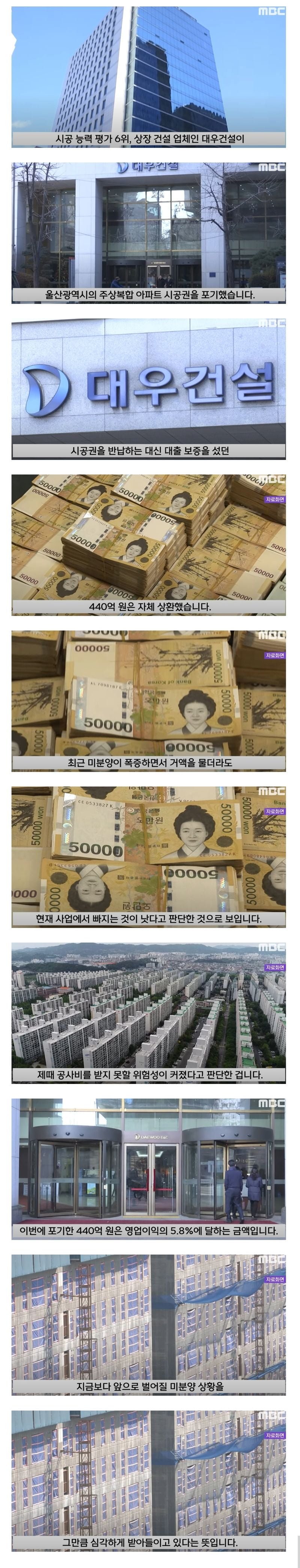 대우건설은 울산광역시의 주상복합 아파트 시공권을 포기하기로 결정하였다. 대우건설은 시공 능력 평가에서 6위를 차지하며 상장된 건설업체이다. 대우건설은 이번 결정을 통해 500억 원을 대출 보증으로 대신 세우기로 했던 시공권을 반납하게 되었다. 또한, 15억 원을 상환하였다. 이 결정은 최근에 미분양이 폭증하는 상황에서 사업에서 빠지는 것이 더 나은 판단이었다고 보인다. 이로 인해 대우건설은 앞으로 벌어질 미분양 상황을 고려하여 위험성을 줄이기로 한 것으로 해석되었다. 이러한 결정으로 대우건설은 영업이익의 5.8%에 해당하는 440억 원을 포기하게 되었다.