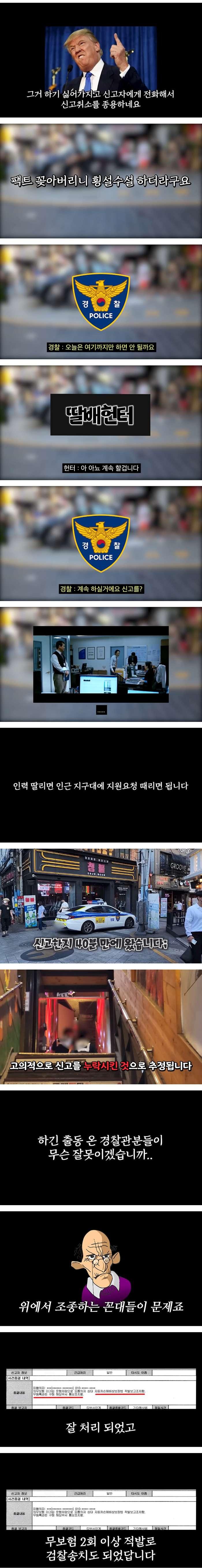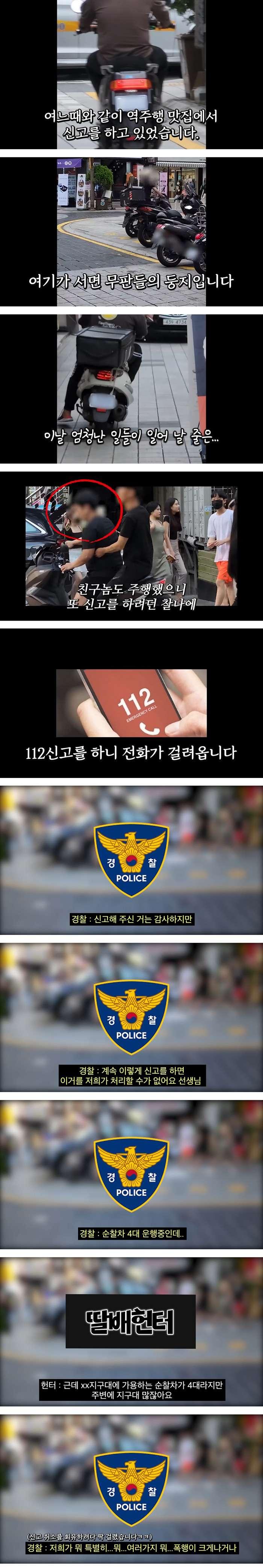 경찰의 회유: 경찰은 이런 신고를 지속적으로 할 경우 처리가 어렵다고 말했다. 경찰은 특별히 뭐..여러가지 한다고 말했지만, 신고해준 건 감사하지만 현 상황에선 처리가 어렵다고 했다.