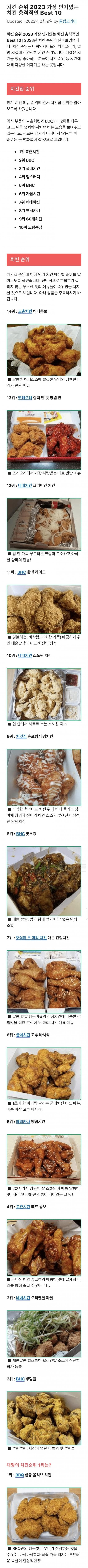 2023년 2월 9일, 디씨인사이드의 치킨갤러리, 일명 치갤에서 인정한 치킨 순위가 발표되었습니다. 치킨집 순위는 교촌치킨과 BBQ가 1,2위를 다투며 뒤를 이어가고 있는 것으로 나타났습니다. 이 순위는 큰 변화 없이 유지될 것으로 예상됩니다. 인기 치킨 메뉴 순위도 조사되어, 전반적으로 맛이 괜찮은 메뉴들이 상위권을 차지한 것으로 보입니다. 그 중에서도 교촌치킨의 허니콤보와 또래오래의 갈릭반 핫양념 반, 그리고 네네치킨의 크리미언 치킨 등이 주목받았습니다. 그 밖의 인기 치킨 메뉴 순위는 다음과 같습니다. 3위는 굽네치킨, 4위는 맘스터치, 5위는 BHC, 6위는 자담치킨, 7위는 네네치킨, 8위는 멕시카나, 9위는 60계치킨, 10위는 노랑통닭입니다. 치킨을 좋아하는 분들에게는 참고할만한 정보가 되리라 생각됩니다.