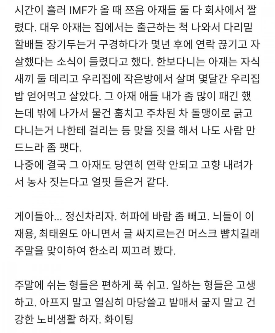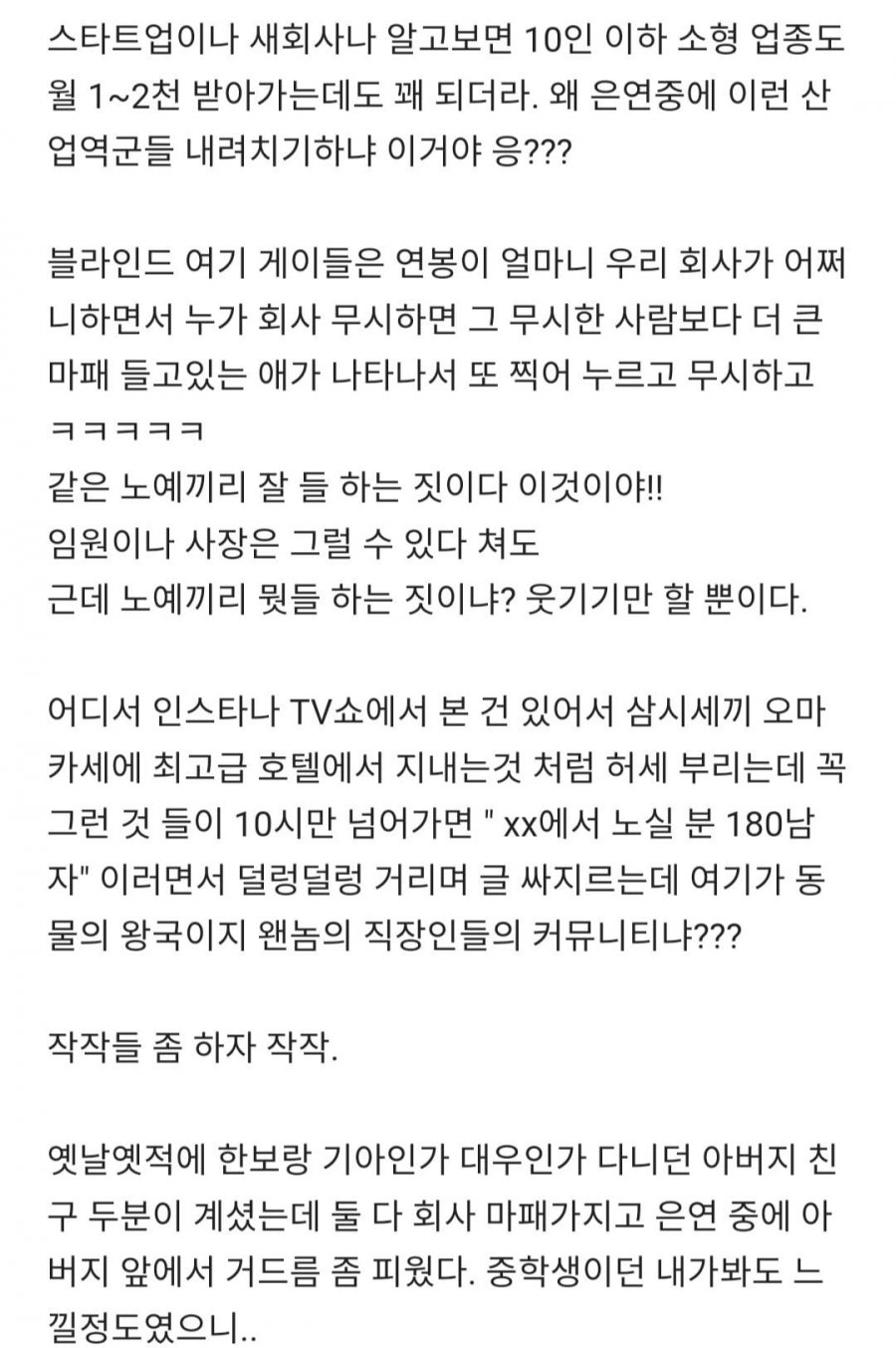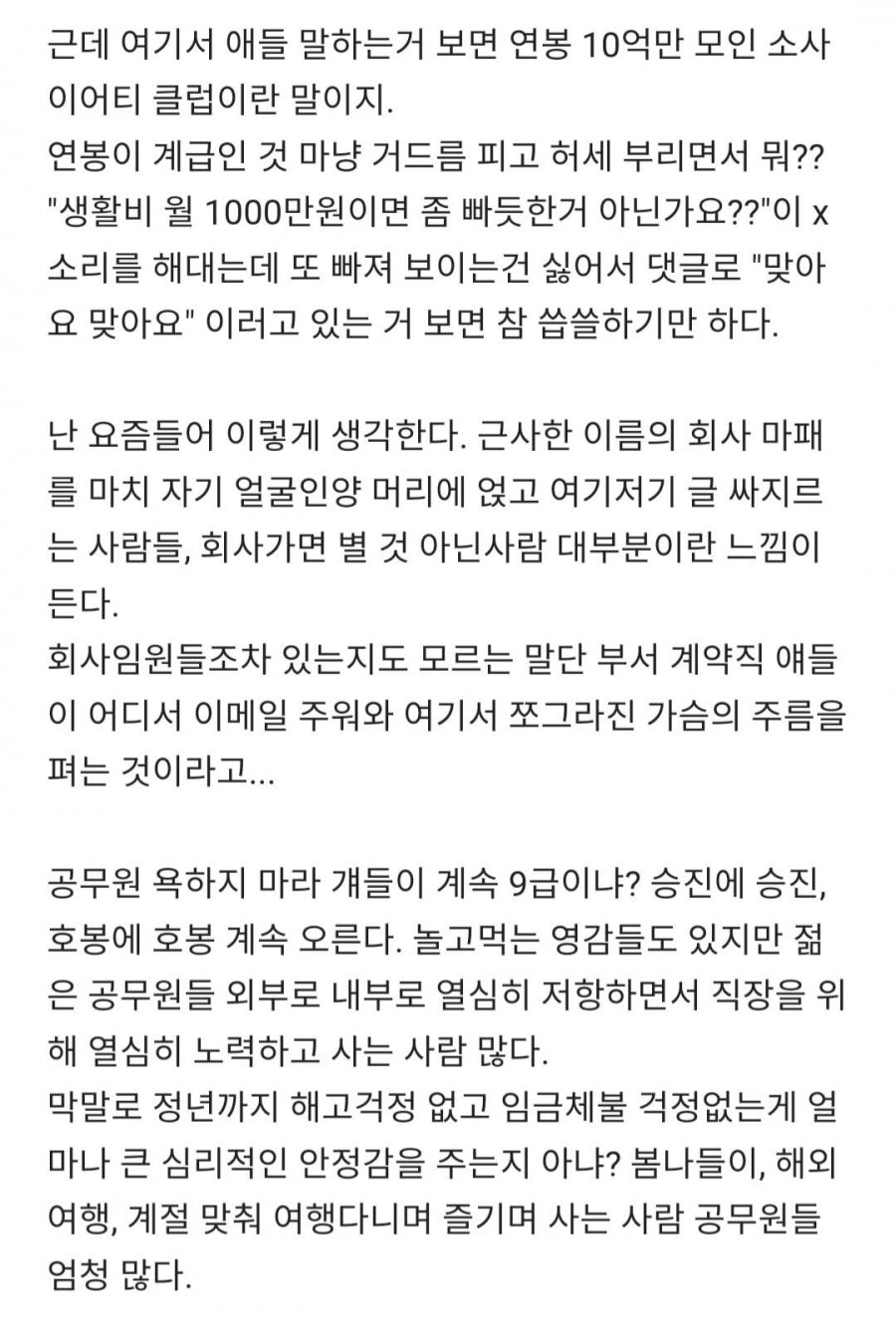 홈 기업리뷰에서는 블라블라 회사에 대한 솔직한 리뷰가 이루어지고 있다. 이곳에는 자신의 회사가 유명하다는 사람들이 마치 임원이 되어있다 마냥 거들먹거리고 앉아있는 것 같은 사람들이 많다. 이러한 현상은 공무원, 새로운 회사, 스타트업 이름만 붙여두면 그들은 아랫사람들을 내려다보는 태도를 가질 정도로 엣헴엣헴한다. 심지어 삼성전자에서도 임원도 직원이고, 카페 직원도 삼성직원이라는데도 그들은 연봉이 계급인 것 마냥 거들먹거리며 허세를 부린다. 혹시 "생활비 월 1000만원이면 빠듯한게 아닐까요?"라는 말에도 빠져보이지 않으려는 듯 댓글로 "맞아요 맞아요"라고만 하면서 참으로 씁쓸해진다. 자기를 근사한 이름의 회사에 실로 자신의 얼굴인양 머리에 마치 마패를 얹고 여기저기 글을 쓰는 사람들은 곧 회사에 가면 그렇게 대단한 사람들이 아니라는 느낌이다. 심지어 회사 임원조차 존재조차 모르는 말단 부서의 계약직들이 어디에서 이메일을 주우며 여기서 쪼그라진 가슴의 주름을 펴는 것이라고... 작은 일들을 조금씩 하자고 생각한다. 공무원들에 대한 욕은 멈추자. 그들은 계속해서 승진하고 호봉도 올린다. 놀고먹은 영감들도 있지만 젊은 공무원들은 내부와 외부에서 열심히 저항하며 회사를 위해 노력하는 사람들이 많다. 그들은 정년까지 해고 걱정도 없고 임금체불 걱정도 없어서 얼마나 큰 심리적인 안정감을 얻을 수 있는지 알 것이다. 봄나들이, 해외 여행을 다녀오는 것은