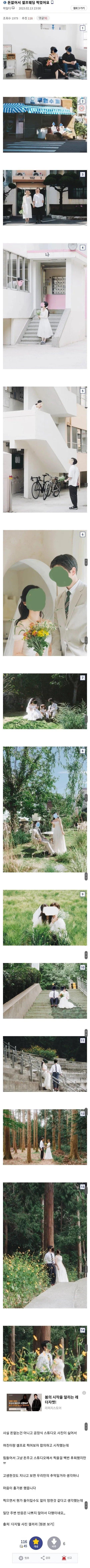 돈이 없어서 셀프 웨딩을 찍었어요. 저는 제 여자친구와 합의해서 찍기로 결정했는데, 셀프로 찍으려고 애써서 정말 힘들었어요. 돈이 없는 것은 아니지만, 공장식 스튜디오 사진은 싫어서 지스토어에서 고생하면서 찍었어요. 그래도 이렇게 보면 우리만의 소중한 추억일 거라고 생각하니까 괜찮아요. 주변 반응도 나쁘지 않아서 다행이에요. 처음에는 돈을 주고 스튜디오에서 찍었어도 좋았을 텐데 후회하고 있어요. 찍으면서 망한 것 같다는 생각도 들지만, 어쩔 수 없어요.