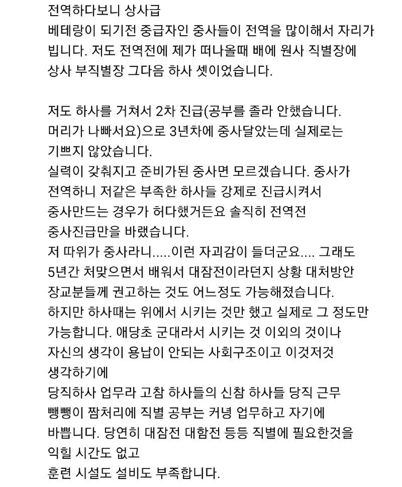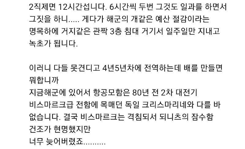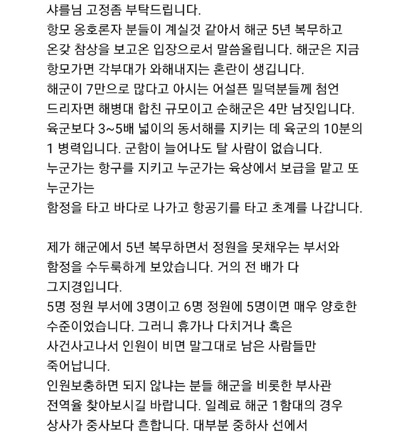 의 역량으로 해결해야할 문제는 해군에서는 항모의 부족이나 정원 부족인 것 같습니다. 항모가 가면 각부대의 혼란이 생기는 상황이 발생하고, 해군의 병력은 육군의 10분의 1 정도밖에 되지 않으며, 인원보충이 어려운 상황입니다. 또한, 상사급 베테랑이 전역하면서 중사 직급에 대한 부족한 인원들의 강제진급이 이루어지는 상황도 발생하고 있습니다. 이에 대해 저는 해군에서 5년 동안 배우고 경험한 것을 바탕으로 대잠전과 상황 대처방안 등을 권고할 수 있었지만, 하사 시절에는 시키는 것 이외의 업무에 대한 자율적인 역량이 부족했습니다. 결국 해군에서의 경험은 제게 자괴감을 안겨줬습니다. 그렇기 때문에 해군에서의 상황을 고려하여 샤를님에게 고정을 부탁드립니다.