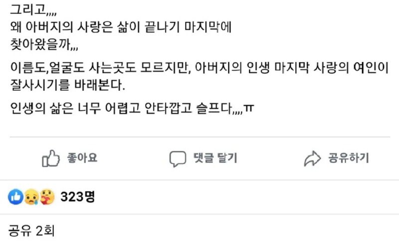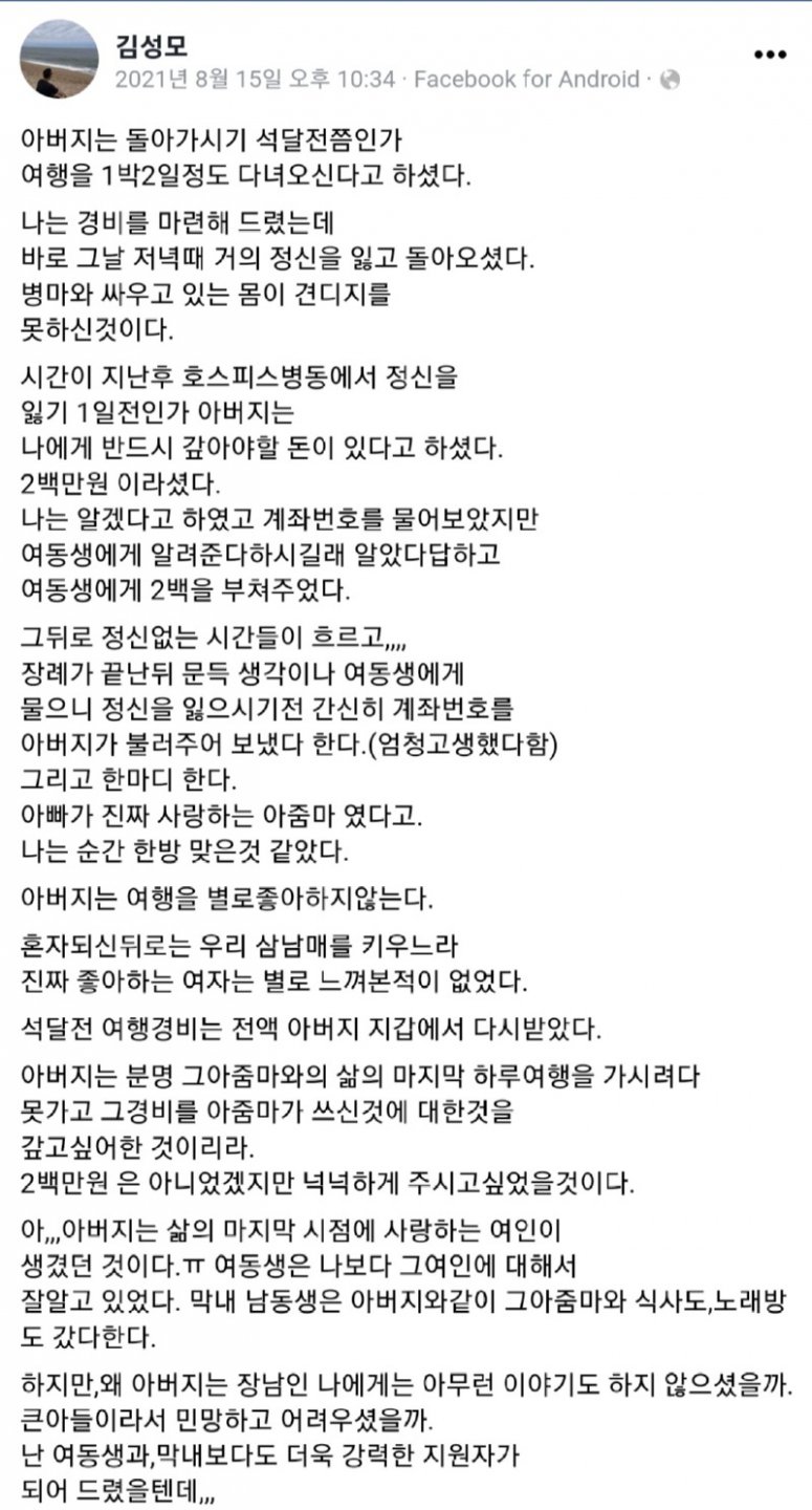 아버지는 석달 전쯤인가 여행을 가신다는 소식을 전해주셨다. 경비를 내 드렸고, 그날 저녁 무렵에 정신을 잃고 돌아오셨다. 아버지는 병에 시달리시는 상태였던 것 같았다. 시간이 지나 호스피스병동에서의 정신이 흐린 일이 발생하기 전에, 아버지는 남겨야 할 돈이 있다고 말씀하셨다. 2백만원이 필요하다고 했다. 나는 알겠다고 말했고, 계좌번호를 물어봤지만 아버지는 여동생에게 알려준다고 하셨다. 그래서 나는 여동생에게 2백만원을 넘겨주었다. 그 이후로 정신 없는 일들이 계속되었다. 장례가 끝난 후, 생각이 드는데 여동생한테 물어봤더니, 아버지는 정신을 잃기 전에 가까스로 계좌번호를 알려주었다고 한다. 아버지는 많이 힘들었나봐. 그리고 말했다. 아빠가 진짜 사랑하는 여자였다고. 그 순간 나는 충격을 받았다. 아버지는 여행을 좋아하지 않았다. 혼자 되신 이후로는 우리 형제들을 키우느라 진짜 좋아하는 여자는 별로 없었다. 석달 전의 여행 경비는 다시 아버지 지갑에서 받았다. 아버지는 분명 그 여인과의 마지막 하루 여행을 하려고 했는데, 못 가고 그 돈을 그 여인이 쓴 것을 갚고 싶어서 그런 것이었겠지. 2백만원은 아니었겠지만, 넉넉하게 주시고 싶었을 거다. 아버지가 삶의 마지막 시점에 사랑하는 여인이 생겼다는 사실이다. 여동생은 그 여인에 대해 나보다 더 잘 알고 있었다. 막내 남동생도 아버지와 함께 그 여인과 식사하고 노래방에 가기도 했다. 그렇다면 왜 아버지는 장남인 나에게는 어떤 이야기도 전하지 않으셨을까? 큰 아들이라서 민망하고 어려웠던 것일까? 나는 여동생과 막내보다 더욱 강력한 지원자였을 것인데... 그리고 왜 아버지의 사랑은 삶이 끝나기 직전에 찾아왔을까... 그 아줌마의 이름도, 얼굴도, 사는 곳도 모르지만, 아버지의 인생 마지막 사랑의 여인이 행복하게 살길 바란다. 인생은 너무 어렵고 안타깝고 슬프다... 아버지를 그리워하며, 쾌하시고 있기를 바란다.