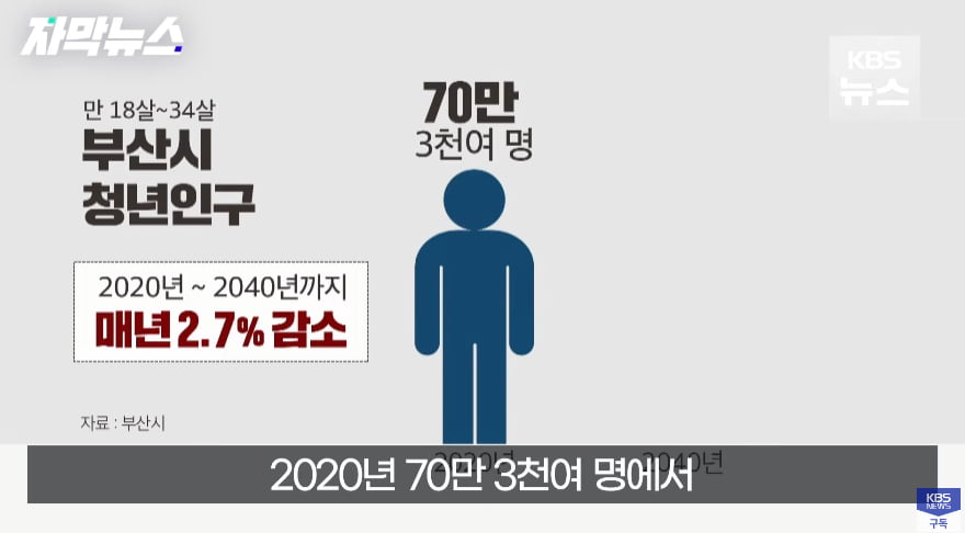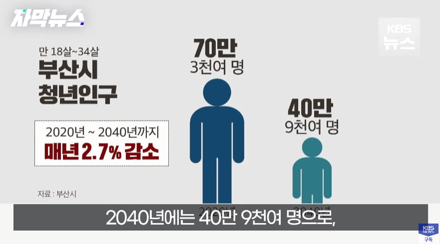 부산시의 청년 인구는 2020년부터 2040년까지 연간 2.7%씩 감소할 것으로 예상됩니다. 2020년에는 70만 3천여 명이었던 청년 인구는 2040년에는 40만 9천여 명으로 줄어들 것으로 예측됩니다. 이에 따라 부산시 자막뉴스에 따르면 김현선 부산시 빅데이터통계과장은 청년들이 취업을 위해 수도권으로 이동하고 있다고 밝혔습니다. 이러한 청년 인구의 감소는 부산시에서 큰 이슈로 대두되고 있는 것으로 보입니다.