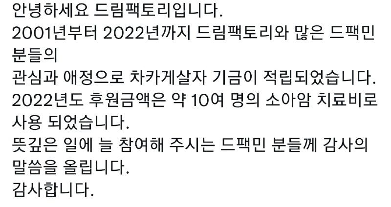 드림팩토리는 2001년부터 2022년까지 많은 드팩민 분들의 관심과 애정으로 차카게살자 기금을 적립해왔습니다. 이 기금은 2022년에 약 10여 명의 소아암 치료비로 사용되었습니다. 우리의 소중한 드팩민 분들께 항상 감사의 말씀을 전하며, 차카게살자 기금 적립 현황을 안내드리겠습니다.