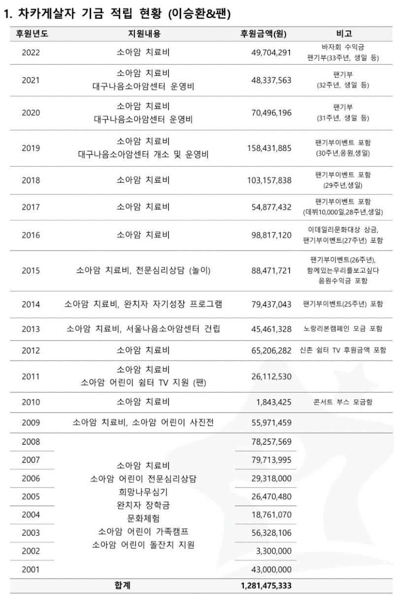 비고: 바자회 수익금, 팬기부(생일 등) 등의 다양한 방법으로 후원금액이 모아졌습니다.