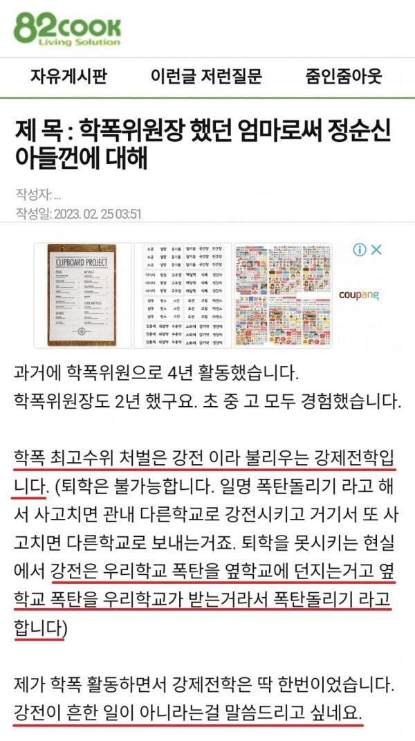 2023년 2월 25일에 작성된 "학폭위원장했던 엄마로써 정순신 아들껀에 대해"라는 제목의 글인데요. 작성자는 82cook Living Solution 자유게시판이라고 합니다. 글에는 CLIPBOARD PROJECT, 상담 등기, 소금, 설탕, 고추장, 다시다, 원장, 현장, 24장 상주 청소, 일부 원스 스킨 로션, 그림 에센스, 일부 링스 스핑 로션, 크림, 에센스, 줌인줌아웃, 진동에 위장약, 수동작 소화에 EMORE X coupang 등 다양한 단어들이 들어가 있습니다.