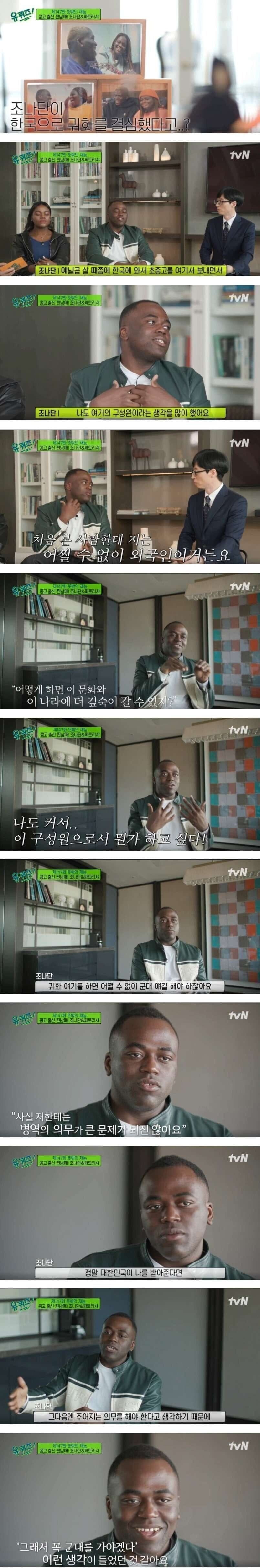 조나단이 한국으로 귀화를 결심한 이야기인 '유퀴즈' 제147화는 뜻밖의 재능을 가진 콩고 출신 남매 조나단과 파트리샤의 이야기를 다루고 있다. 조나단은 어릴 때부터 한국에 관심이 많았고 한국으로 와서 초중고를 다니며 한국 문화에 더 깊이 몰입하고 싶었다. 처음에는 외국인으로 여겨져 어쩔 수 없이 힘들었지만 조나단은 이 구성원으로서 뭔가 하고 싶어했다. 군대에 가야 할 의무가 있는 조나단은 대한민국이 꼭 나를 받아준다면 군생활을 각오하기로 결심했다.