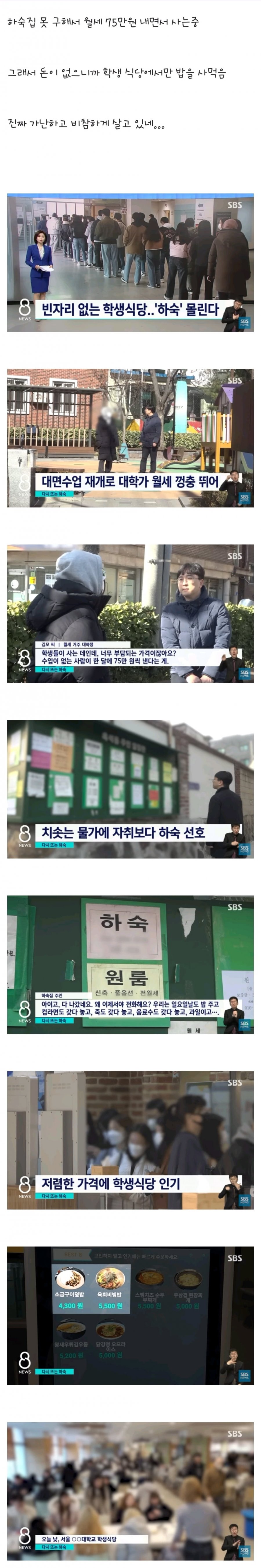 요약: 매달 75만 원을 내면서 월세로 생활하는 대학생이 학생 식당에서 식사를 하며 가난하고 비참한 삶을 보내고 있다. 학생식당은 2차 8 빈자리가 없어서 많은 사람들이 모여들고 있다. 하숙집은 다시 인기를 얻고 있는데, 자취보다 가격이 저렴하고 학식도 좋다는 이유다. 하지만 물가 상승으로 인해 대학가의 월세도 높아지고 있는 상황이다. 하숙집 주인은 가격에 대해 학생들과의 대화를 벌였지만, 학생들은 가격이 너무 부담스럽다고 주장하고 있다.