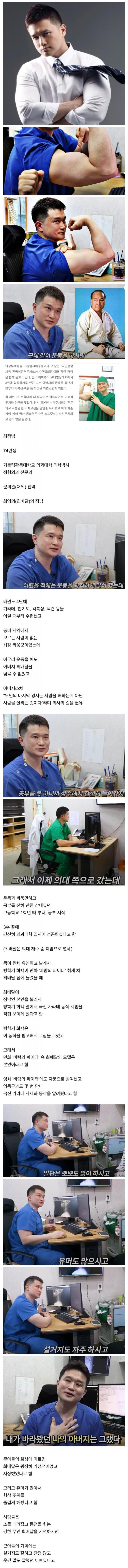 의정부백병원 최광범 정형외과 과장은 MMA 연합회장을 자처하며 다니고 있다. 그는 어릴 적부터 아버지의 권유로 무술을 익혔으며, 아마추어 보디빌딩대회에서도 입상을 하기도 했다. K1 서울대회 때 팀닥터로 합류하면서 이종격투기와 인연을 맺게 되었다. 현역 의사인 일본인 수석주치의는 한국 치료진을 무시하여 최광범의 자존심을 상하게 했고, 그래서 그는 국산 종합격투기인 스프릿MC의 수석주치의가 되기 위해 노력하였다. 최광범은 현재 가톨릭관동대학교에서 의학박사로 군의관으로 복무한 후 전역하였다. 그는 또한 태권도 4단의 선수로 활약하였고, 어릴 적부터 많은 운동을 하며 엄청난 체력을 가지고 있었다. 그는 이제 의대에 진학하였지만 운동과 싸움만 하다가 전혀 공부를 하지 않았던 상태였다. 그러나 아버지의 죽음 이후 의사의 길을 권유받아 공부를 하기로 결심하였고, 몇 차례의 재수를 거쳐 의과대학 입시에 성공하였다. 최광범은 아버지의 영향으로 의사인 동안 빼면 기간동안 봤던 만화 '바람의 파이터'에서 최배달의 모델이 된다고 한다. 그는 영화 '바람의 파이터'에도 자문으로 참여하고, 몇 번 양동근과도 만나 동작을 알려주었다고 한다.