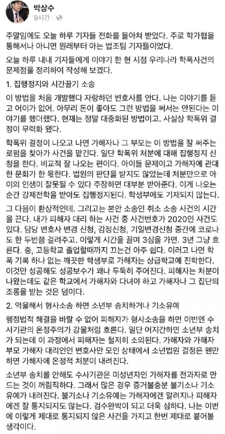는 친분이 있고 옹호하는 변호사들이 등장한다. 그리고 피해자는 형사재판까지 감당해야 하지만, 보통은 기소유예나 벌금 처분으로 끝나게 된다. 결과적으로 피해자는 억울함을 남기고 있으며, 가해자와의 동일한 학교 생활을 갖게 된다.