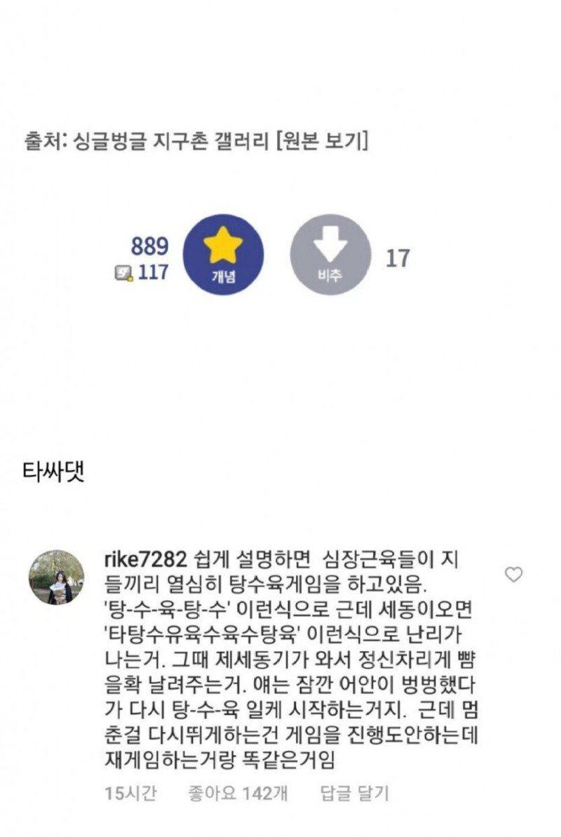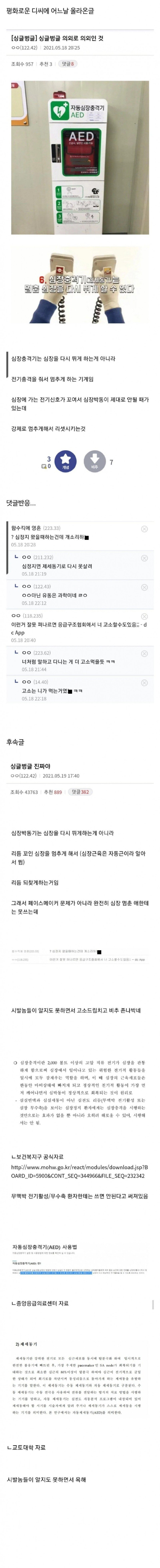 [싱글벙글] 이슈인 글이 평화로운 디씨에 올라왔다. 글은 싱글벙글이라는 닉네임의 작성자가 "의외로 의외인 것"에 대한 이야기를 한 내용이다. 심장충격기에 대해 언급된 글에서는 이 기기가 심장을 멈추게 하는 것이 아니라 리셋시키기 위해 전기충격을 주는 것이라고 설명하고 있다. 이 글에 대한 댓글에서는 이 설명에 의문을 제기하는 사람들도 있었다. 그러나 글 작성자는 심장을 다시 뛰게 할 수 없다고 답변하였고, 정보를 잘못 전하면 고소할 수도 있다는 경고도 했다.
