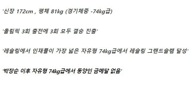 한국은 박장순을 비롯한 많은 레슬링 선수를 배출하였습니다. 레슬링은 한국에서 매우 보급되어 있으며, 자유형 레슬링이 주류입니다. 실제로 미국, 터키, 아제르바이잔, 아르메니아, 조지아 등 국가들과 함께 자유형 레슬링에서 성과를 내고 있습니다. 특히 한국인 중에서도 74kg급에서 운 금메달을 딴 선수가 있습니다. 그러나 경량급 이외의 선수들은 찾기가 어렵습니다.
