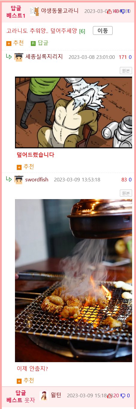 2023년 3월 3일, 한 사용자가 야생동물인 고라니에게 추운 날씨라고 덮어주기를 요청하는 게시물을 작성했다. 동물을 걱정하는 다른 사용자들이 답글을 달았다. 이어서 2023년 3월 8일, 다른 사용자가 이미 추운 날씨가 끝난 것 아니냐며 답글을 작성했다. 그리고 2023년 3월 9일, 어느 사용자가 덮어줬다는 글을 올렸고 다른 사용자가 웃자 어시하며 답글을 작성했다. 마지막으로 3월 9일, 다른 사용자가 답글을 달았다.