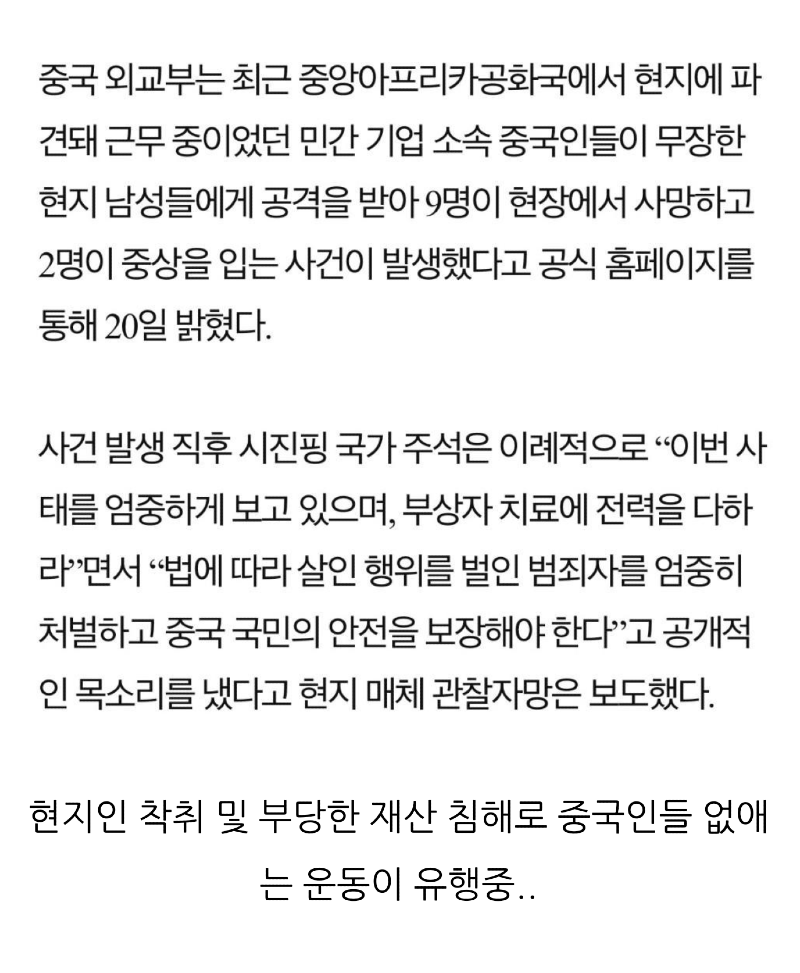 중국인들이 아프리카에서 활발한 중국인 살해 운동을 벌이고 있는 것으로 전해졌다. 최근 중앙아프리카공화국에서 중국인들이 공격을 받아 9명이 사망하고 2명이 중상을 입었다고 중국 외교부가 밝혔다. 이에 시진핑 국가주석은 사건을 엄중하게 대처해야 한다고 밝히며 범죄자들을 엄중히 처벌할 것을 촉구했다. 이러한 사건이 발생한 이유는 현지인들이 중국인들을 착취하고 부당하게 재산을 침해하는 운동이 유행하고 있기 때문으로 추정된다.