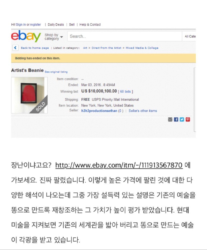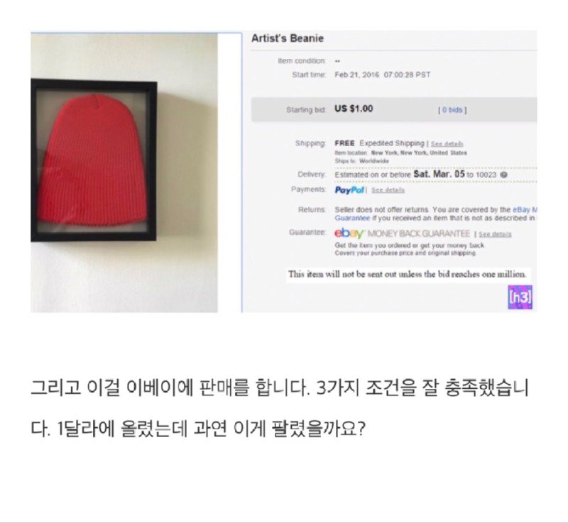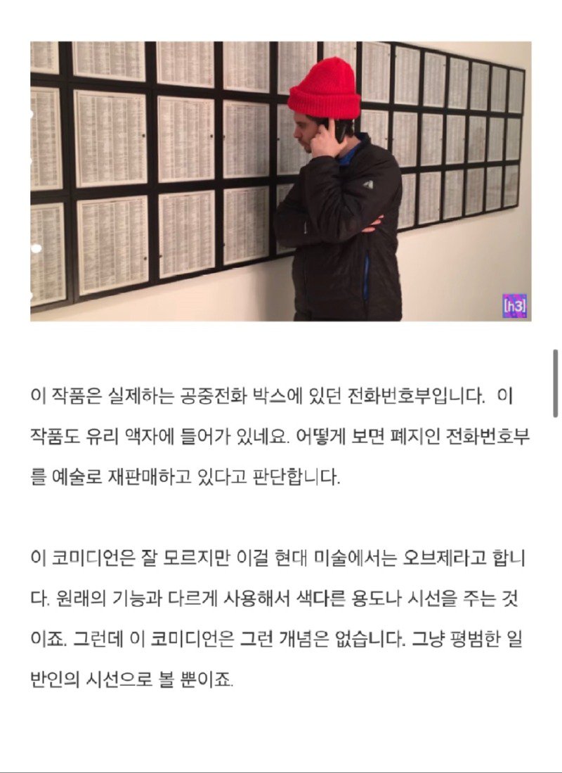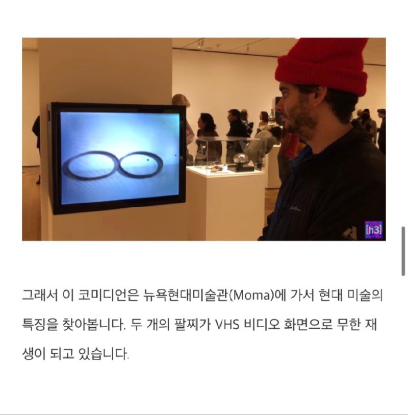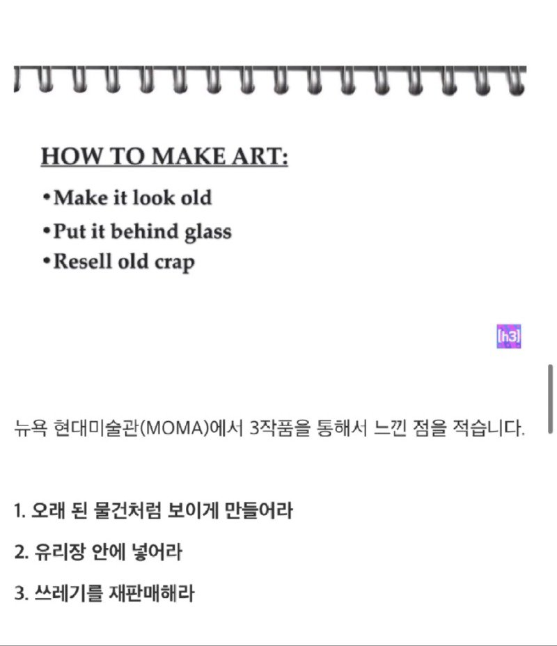 현대 미술의 비싼 이유는 경매 시스템 때문인가? 뉴욕현대미술관(Moma)을 찾아본 결과, 작품의 특징을 확인할 수 있었습니다. VHS 비디오 화면으로 무한 재생되는 두 개의 팔찌, 돌이 있는 유리 상자 안에 놓인 작품 등 모두 고가의 가격을 가지고 있었습니다. 또한 전화번호부와 같은폐지인 물건도 예술로 재판매되고 있었습니다. 이러한 현대 미술의 개념에 대해서는 이 코미디언은 잘 모르지만, 그저 일반인의 시선으로 볼 뿐이었습니다. 이렇게 여러 작품을 통해 느낀 점은 쓰레기인 것들도 유리 액자에 담아두었을 때 예술 작품으로 보이게 된다는 점이었습니다. 이를 염두에 두고, 나도 조건을 충족하는 현대 미술 작품을 만들어 보기로 결정하였습니다.