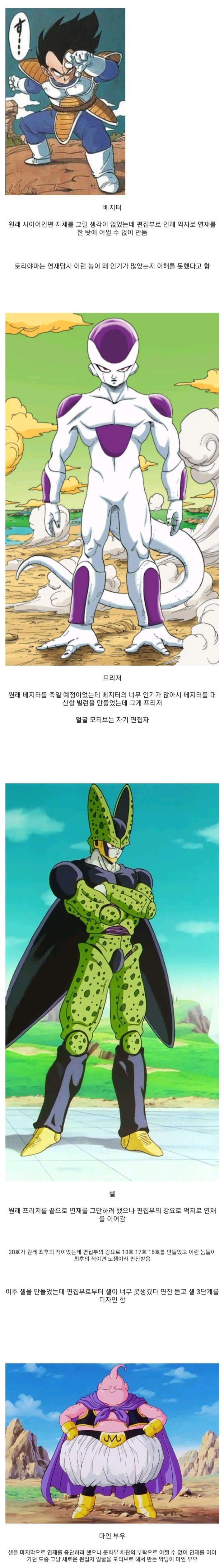 베지터 원래 사이어인 편을 그리라는 생각이 없었지만 편집부의 강요로 인해 억지로 연재를 하게 되었다. 프리저는 베지터를 죽일 예정이었지만 베지터가 인기가 많아져서 대신할 빌런으로 만들게 되었다. 프리저의 얼굴은 자기 자신을 모티브로 만들었다. 셀은 원래 프리저를 끝으로 연재를 그만두려고 했지만 편집부의 강요로 억지로 이어갔다. 20호는 최후의 적으로 원래 계획되었지만 편집부의 요구로 최의로 바뀌게 되었다. 토리야마는 연재당시 프리저가 왜 인기가 많은지 이해하지 못한 채 20호를 만들었다. 그 후에는 셀을 만들었는데 편집부로부터 셀이 못생겼다는 핀잔을 듣고 셀 3단계를 디자인했다. 마지막으로 연재를 중단하려 했지만 편집자의 억지로 억지로 연재를 이어갔다. 베스트 2처럼 그들은 편집자인 것 같다는 답글을 받았다. 작성자는 그런 놈들이 왜 인기가 있는지 이해하지 못했다고 한다. 후에 18호와 17호, 16호를 만들었고 이런 놈들도 핀잔을 받았다. 마인부우 게시판에서는 문화차 모티브로 굴렀다는 답글도 있었다. 어쩔 수 없이 연재를 이어갈 수 밖에 없었고 관의 만 악당은 재밌었다.