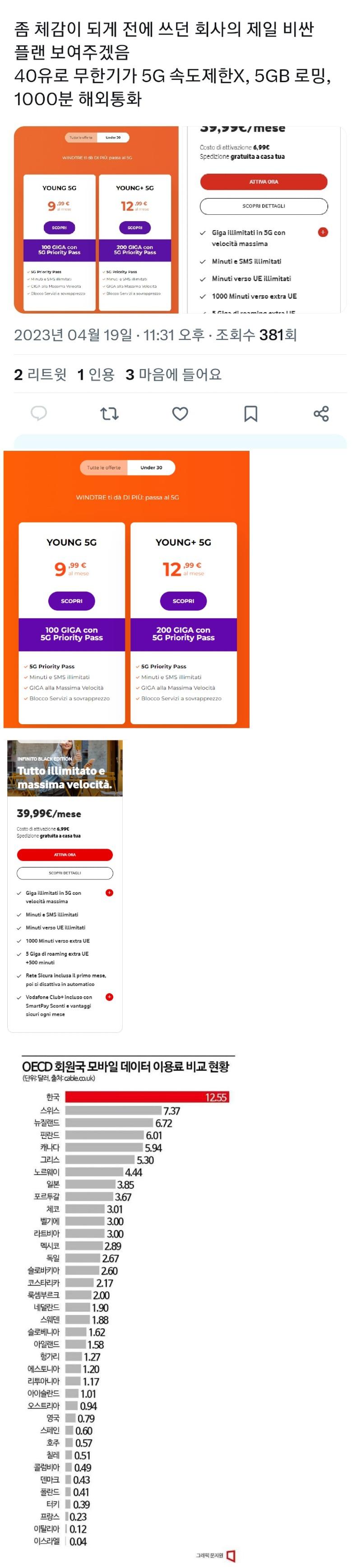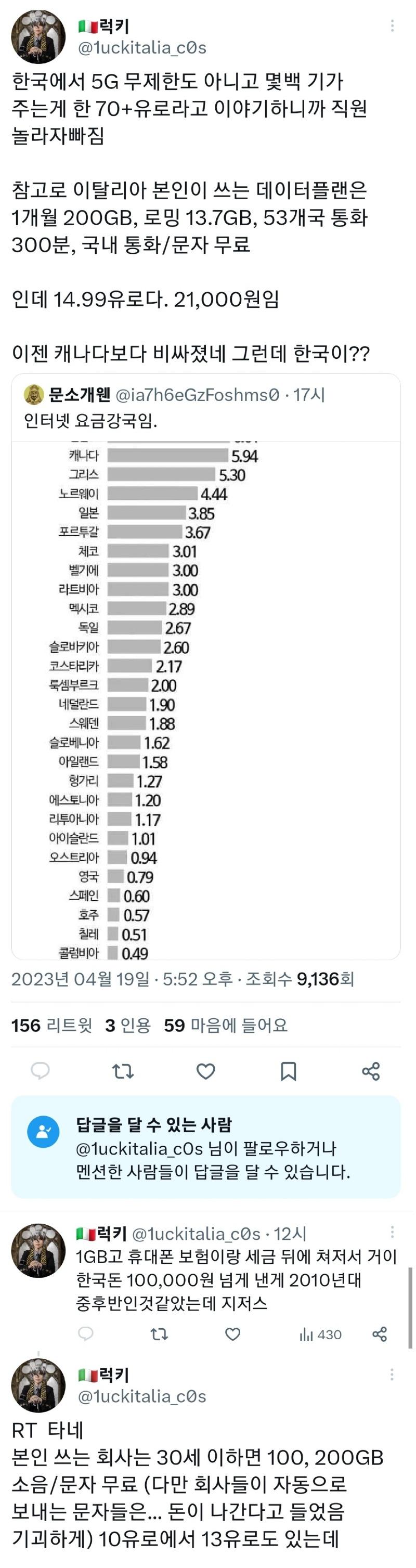한국에서는 5G 무제한도 아니고 몇백 기가를 주는데, 약 70 유로라고 하니 직원들은 놀라고 당황해했다. 그와는 달리 이태리에서는 본인이 사용하는 데이터 플랜은 1개월에 200GB, 로밍 13.7GB, 53개국 통화 300분, 국내 통화/문자는 무료인데 14.99유로로 이용할 수 있다. 이는 약 21,000원이다. 이제는 캐나다보다도 비싸지게 되었다. 그렇다고 한국이 어떤지는 모르겠지만, 이태리는 인터넷 요금이 매우 비쌌다고 한다. 캐나다, 그리스, 노르웨이, 일본, 포르투갈, 체코, 벨기에, 라트비아, 멕시코, 독일, 슬로바키아, 코스타리카, 룩셈부르크, 네덜란드, 스웨덴, 슬로베니아, 아일랜드, 헝가리, 에스토니아, 리투아니아, 아이슬란드, 오스트리아, 영국, 스페인, 호주, 칠레, 콜롬비아는 모두 이태리보다 인터넷 요금이 싸다. 2023년 4월 19일 현재, 5G 가입자는 9,136명이며, 156명이 리트윗하고, 3명이 인용하였으며, 59명이 마음에 들어한다고 했다. 답글을 달 수 있는 사람은 @luckitalia_cOs이며, @luckitalia_cOs와 멘션한 사람들이 답글을 달 수 있다. 이사람은 1GB의 데이터를 사용하고 있으며, 휴대폰 보험과 세금을 빼면 약 100,000원 정도 한국돈을 지불한 것으로 보인다. 이는 2010년대 중후반이었던 것 같다. 이제는 YOUNG 5G를 사용하고 있다. 또한, 회사에서는 30세 이하면 100, 200GB의 소음/문자는 무료로 제공한다고 한다. 단, 회사가 보내는 자동 문자는 돈이 나간다고 한다. 10유로에서 13유로까지 다양한 가격대의 플랜이 있지만, 체감이 되게 전에 사용하던 회사의 가장 비싼 플랜을 보여줬다. SCOPRI 40이다.
