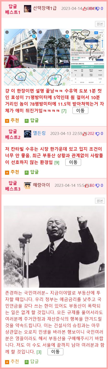 또한 다른 게시글에서는 전용면적이 78m²와 84m²인 아파트에 대한 정보를 제공하였고, 다른 댓글에서는 칸타빌 수유의 입지와 입지 조건에 대해 비판적인 의견을 나타내며 환경이 좋지 않다고 지적되었습니다.