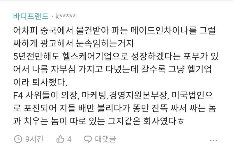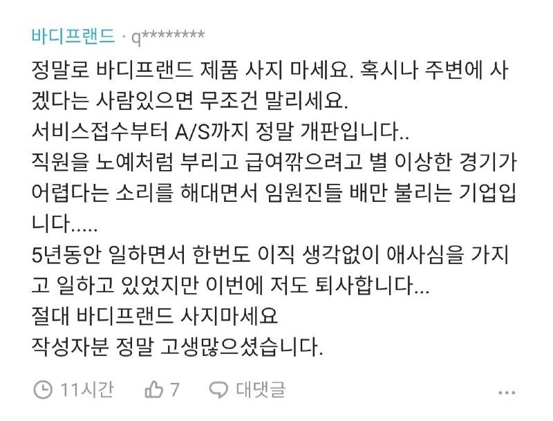 회사생활 바디프랜드에서 4년 동안 일했지만 더 이상 다닐 수 없다고 결정했습니다. 그런데 이 회사의 고객센터 인원이 12명밖에 되지 않는다고 합니다. 고객만족 서비스 지원팀이라면 인원이 이게 맞을까요? 전화를 대기할 때 기본으로 40분이나 기다려야하며 전화를 받자마자 욕을먹고 시작합니다. 12명으로는 어떻게 고객센터를 운영할 수 있을까요? 이 회사는 시장바닥 회사인가요? 시장바닥 회사라도 12명보다는 인원이 많을 것입니다. 안마의자 업계에서 1위로 달리고 있다고 하면서 고객들이 전화를 받으면 무엇을 할까요? 이 회사는 이코노미 제품 외에도 평균적으로 500~800만원짜리 프리미엄 제품도 판매하는데 연락이 이렇게 안되고 제품을 팔고 나면 그만인 회사일까요? 12명 중에 1명은 타 부서, 1명은 챗봇/홈페이지 게시판, 1명은 이전 설정홈페이지 접수 확인, 1명은 기사 어플 접수 업무를 맡고 있고, 남은 8명으로 하루에 2천명이 넘는 전화를 받으라고 합니다. 이게 말이 되나요? 어떤 중소기업이든 회사가 커지면 콜센터 인원은 최소 100명은 될 것입니다. 현재 12명은 정말로 힘들게 일하고 있으며 인센티브도 줄이고, 앞으로는 휴직자 5명과 합쳐서 지급할 예정이라고 합니다. 정말이지 매일 고객으로부터 욕을 먹으며 가장 힘들게 일하고 있는데 이렇게 대우를 받을 수밖에 없는 것인가요? 회사가 돌아가는데 우리 부서가 큰 역할을 하는 것이 맞지 않을까요? 렌탈팀과 통합 후에 회사를 싫어하면 나가라는 말을 하시는데 새로 뽑으면 되지 않을까요? 고생하며 일하고 있는 직원들을 챙기고 인센티브를 공정하게 분배하는 것도 안 된다면 휴직자와 함께 나누겠다는 건가요? 정말 장난하시는 건가요? 저희가 떠나라는 말인가요? 저도 4년간 이 회사를 위해 몸을 바쳤지만 더 이상 버틸 수 없습니다. 다 나갈 테니까 새로운 직원을 뽑아서 새로운 팀을 구성해 보세요. 저희보다 더 잘하고 운영할 수 있는 분이 있을거라고 생각합니다. 하시는 행동이 정말로 저희를 내쫓는 것 같아요.