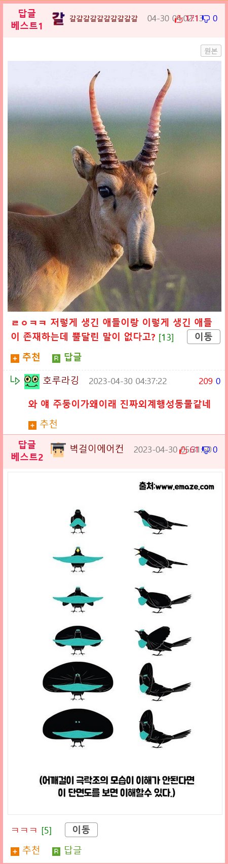 베스트 2 글에서는 "와 얘 주둥이가 왜 이래 진짜 외계 행성 동물 같네"라는 내용을 다루고 있습니다.