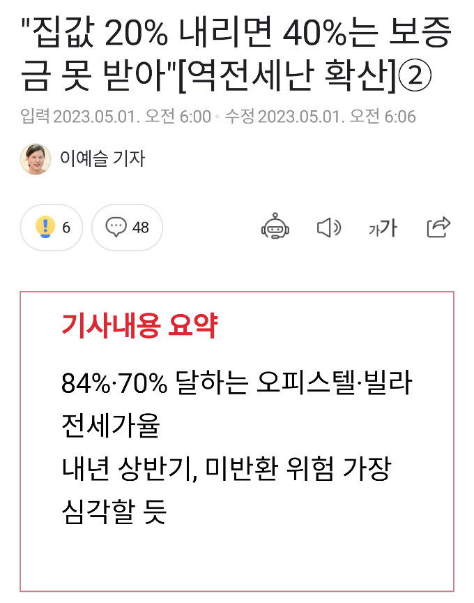 2023년 5월 1일 오전 6시에 입력된 글은 "집값 20% 내리면 40%는 보증금 못 받아" 라는 제목을 가지고 있다. 이 글은 현재의 역전세 난을 다루고 있으며, 전·월세 문제를 해결하기 위한 지침서와 관련 법률해석과 법원 판례를 제시하고 있다.