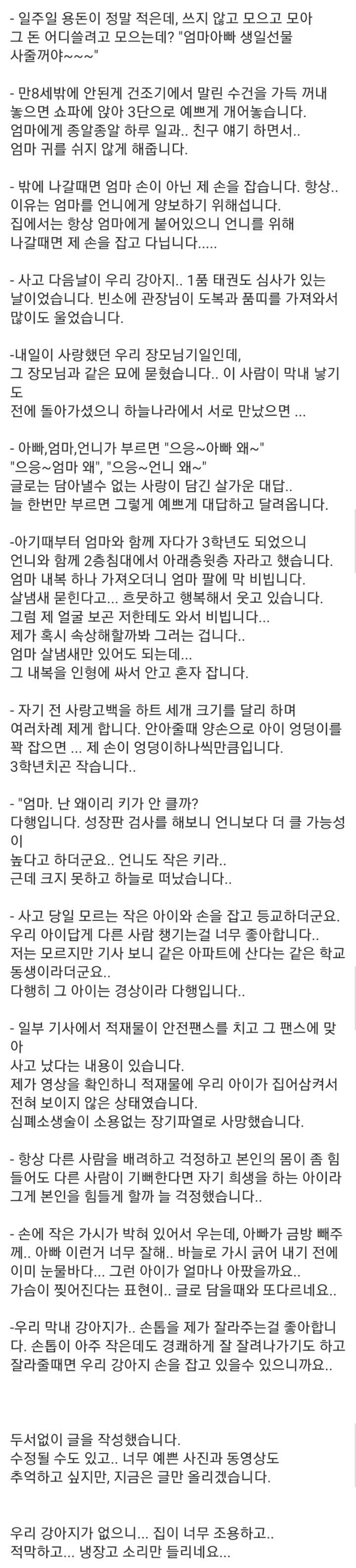 부산 영도구 청학동에 사는 A양 아빠입니다. 오늘은 저희 가족이 겪은 사고로 인해 힘든 시간을 보내고 있습니다. 그동안 사고를 듣고는 다른 사람들의 일이라고만 생각했는데, 이제는 우리 가족에게도 일어날 수 있다는 걸 깨닫게 되었습니다. 여전히 실감이 나지 않아서 이 글을 적게 되었습니다.