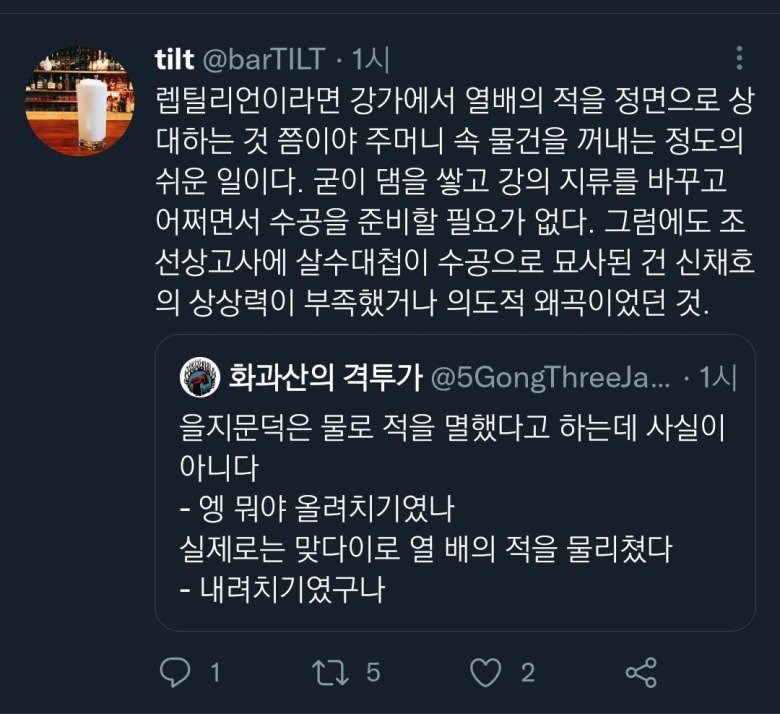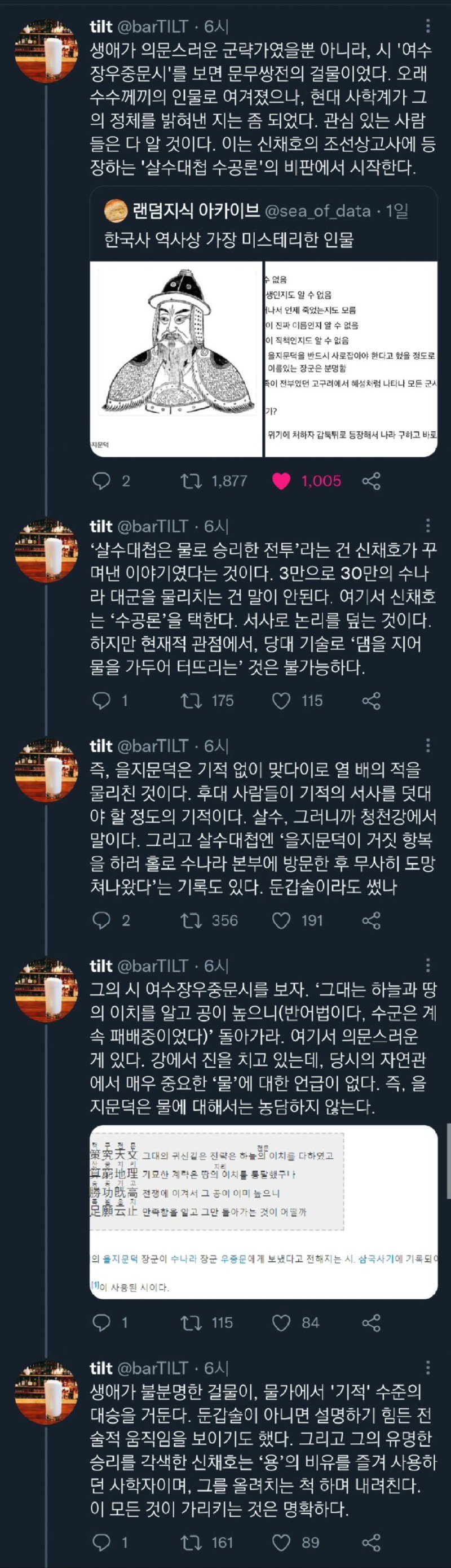 하지만 현대적인 시각에서는 을지문덕의 이야기는 기적적인 일이다. 그는 살수대첩에서 조류청천강을 이용하여 열 배의 적을 물리친 것이다. 실제로 살수대첩에서는 을지문덕이 수나라 본부에 홀로 방문하여 거짓 항복을 한 후 무사히 도망쳐나왔다는 기록도 있다. 어떤 둔갑술이라도 쓴 것일까 싶다. 그의 시인 여수장우중문시를 보자면 그는 하늘과 땅의 이치를 알고 있는 그런 인물이었다. 그가 어떤 방법으로 성취한 것인지는 오랜시간 동안 미스터리한 존재로 남아있을 것이다.