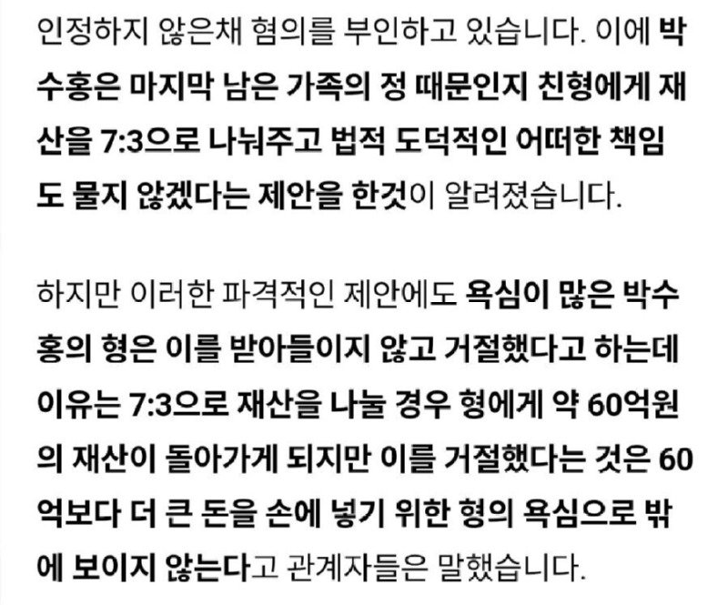 박수홍이 친형에게 재산을 7:3으로 나눠주고 어떠한 책임도 물지 않겠다는 제안을 한 것이 알려졌습니다. 하지만 친형은 이를 받아들이지 않고 거절한 이유는 7:3으로 재산을 나눌 경우 자신이 약 60억 원의 재산을 잃게 되기 때문입니다. 이에 관계자들은 친형이 60억보다 더 큰 돈을 손에 넣기 위한 욕심을 가지고 있다고 말했습니다. 온라인 커뮤니티에서는 이와 관련해 다양한 의견이 나오고 있는 것으로 보입니다.
