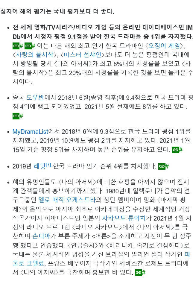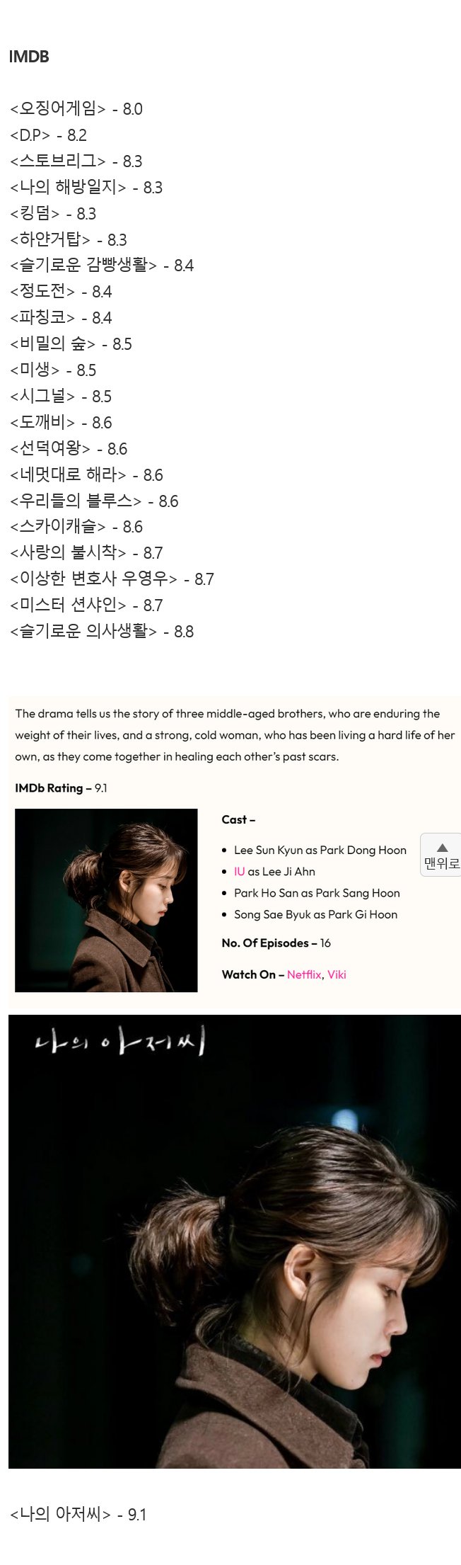 글을 정리해보면, 한국 드라마인 "나의 아저씨"는 전 세계에서 높은 평가를 받았다. IMDB에서 9.1점을 받아 한국 드라마 중 1위를 차지했고, 중국 도우반에서도 평점 4위로 랭크되었다. 또한, MyDramaList에서도 평점 1위를 차지하며 계속해서 높은 순위를 유지하고 있다. "나의 아저씨"는 국내에서도 높은 시청률을 기록했으며, 해외 유명인들도 호평하며 홍보했다. 전 세계적으로도 인기 있는 작품으로 평가받았다.