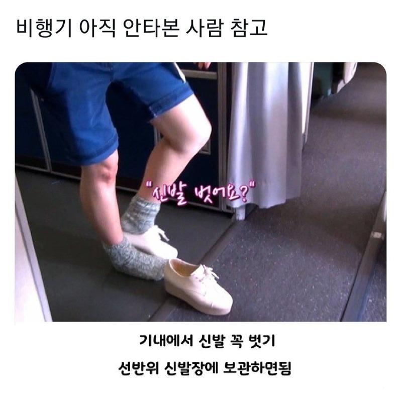 - 비행기에 탑승할 때, 기내에서 신발은 꼭 벗어야 합니다. 신발은 선반 위 신발장에 보관하면 됩니다.