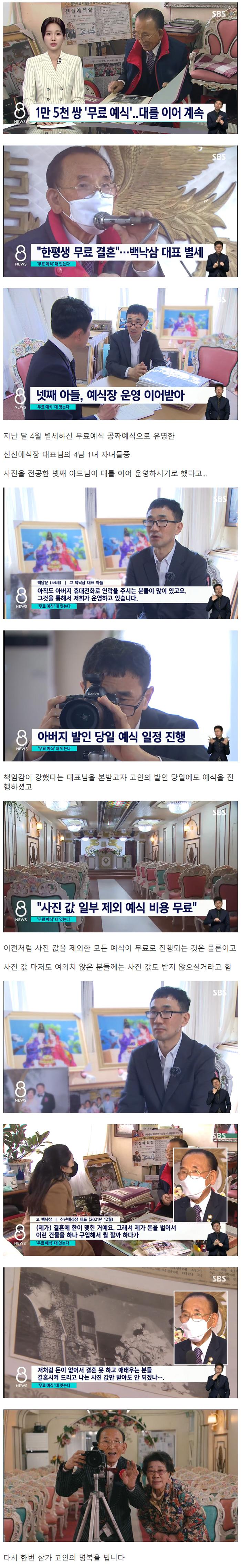 신신예식장은 완전무료로 결혼식을 제공하는데, 이 서비스를 대표하는 백낙삼 대표가 별세한 후에도 계속해서 이어갈 예정이다. 백낙삼 대표의 넷째 아들이 사진 전공을 하고 있어 예식장 운영을 계속할 것이라고 전해졌다. 올해 4월에 백낙삼 대표가 별세한 후, 발인 당일에도 예식을 진행하며 사진 값 제외한 모든 예식을 무료로 제공하고 있다. 사진 값도 여의치 않은 분들에게는 받지 않을 예정이라고 한다. 이러한 결혼식 서비스를 받기 위해 많은 사람들이 백낙삼 대표의 아버지와 연락을 주고 있어, 이를 통해 예식장의 운영이 이루어지고 있다. 결혼을 못하고 슬퍼하는 분들을 위해 돈을 벌어 결혼을 시키겠다는 백낙삼 대표의 뜻에 감동을 받은 많은 이들이 이 서비스를 이용하고 있는 것으로 알려져 있다.