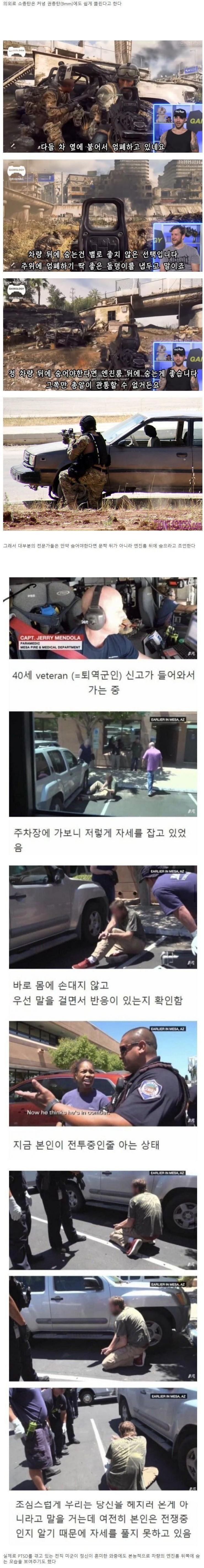 "영화 같은데 보니까 다들 여기에 숨던데? 바로 자동차의 문짝 뒤라고 할 수 있는데... 소총탄은 커녕 권총탄(9mm)에도 쉽게 뚫린다고 한다. 차량 뒤에 숨는건 별로 좋지 않은 선택입니다. 주위에 엄폐하기 딱 좋은 돌덩이를 냅두고 말이죠. 그러나 이게 하나도 못 막습니다. 차량 뒤에 숨어야한다면 엔진룸 뒤에 숨는게 좋습니다. 그쪽만 총알이 관통할 수 없거든요. 실제로 PT는 모습 그래서 대부분의 전문가들은 만약 숨어야한다면 문짝 뒤가 아니라 엔진룸 뒤에 숨으라고 조언한다. 다들 차 옆에 붙어서 엄폐하고 있네요. 몸에 손대지 않고 로걸을 면 말. 40세 veteran 신고가 들어와서 가는 중. 주차장에 가보니 저렇게 자세를 잡고 있음. Now he thinks he's in combat. 지금 본인이 전투중인줄 아는 상태. 반응이 있는지 확인함. 조심스럽게 우리는 당신을 헤치러 온 게 전쟁 중인은 니라고 말을 거는데 여전히 본인지 알기 때문에 자세를 풀지 못하고 있음. 전직 미군이 정신이 혼미한 와중에도 본능적으로 차량의 엔진룸 뒤쪽에 숨을 했다 도."
