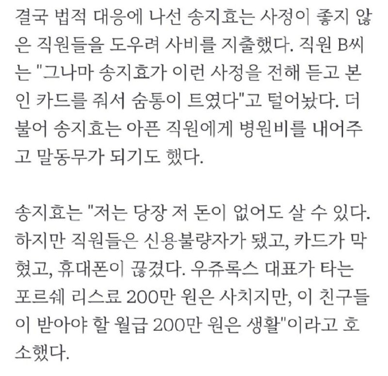 송지효는 사내의 어려운 사정을 알고 있었기 때문에 법적 대응에 나섰다. 그녀는 돈을 사용하여 사정이 좋지 않은 직원들을 돕기 위해 돈을 사용했다. 직원 B씨는 송지효가 이런 사정을 알고 본인 카드를 줘서 마음이 편해졌다고 말했다. 송지효는 아픈 직원들을 위해 병원비를 지불하고 또한 그들의 말동무가 되기도 했다. 송지효는 당장 돈이 없어도 살 수 있다고 했지만, 직원들은 신용불량자가 되었고, 카드가 막혔으며, 휴대폰이 끊어졌다고 말했다. 그녀는 우쥬록스 대표가 타는 포르쉐 리스료가 사치지만, 직원들이 받아야 할 월급이 생활이라고 호소했다.