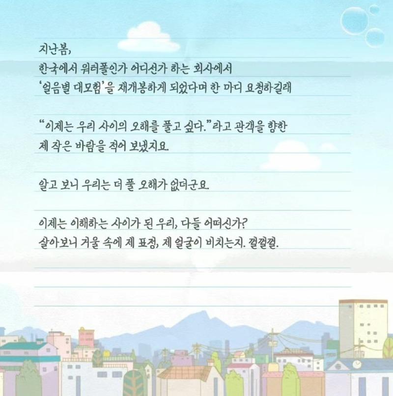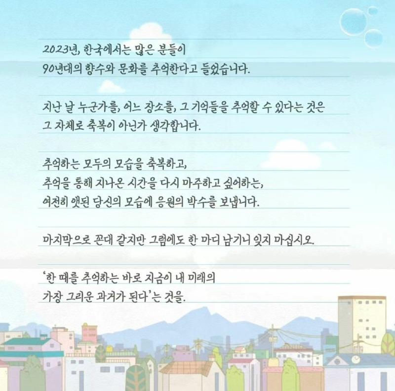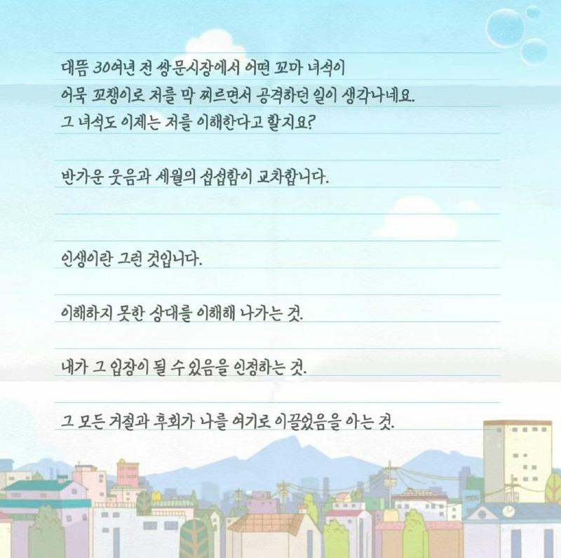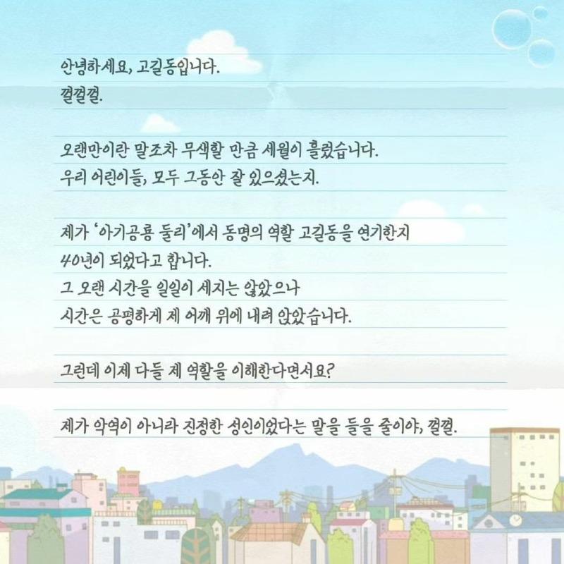 감회하며, 고길동 아저씨가 편지를 쓰며 감회에 잠기고 있습니다. 오랜만에 연기한 역할이나 어린이들을 떠올리며 세월의 흐름을 느낍니다. 악역이 아닌 진정한 성인으로서 이해받고 있는 것에 대해 놀라움을 표현하고, 예전에 쌍문시장에서 어묵 꼬챙이로 맞서 싸웠던 일을 기억하며 그 녀석도 이제는 이해하고 있는지 궁금해 합니다. 나이가 들면서 이해하고 받아들이는 것의 중요성을 깨닫고, 둘리와 친구들에 대한 애정을 표현합니다. 다시 만날 수 없는 그리움은 헤어진 사람을 가슴 깊이 그리워하게 되는 바람과 같다고 말하며, 2023년에는 90년대의 추억들을 되살릴 수 있는 것에 대한 기쁨을 나타냅니다. 또한, 모두가 추억하는 모습을 축복하며, 지나온 시간을 되돌아보는 의미를 감사하게 생각합니다.