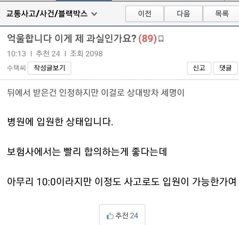교통사고로 인한 사건이 발생했습니다. 글 작성자는 병원에 입원중이며, 자신이 사고를 일으켰다고 인정하고 있습니다. 그러나 상대방 차량에 타고 있던 세 명이 보험사에서 빨리 합의하는 것이 좋다고 한다는데, 이에 대한 의문과 억울함을 표현하고 있습니다. 수택씨는 상대방의 블랙박스 영상을 확인하고 싶다고 했고, 다른 사용자들은 그에게 유쾌한 반응을 보여주고 있습니다. 이에 대해 논란과 토론이 계속되고 있습니다.