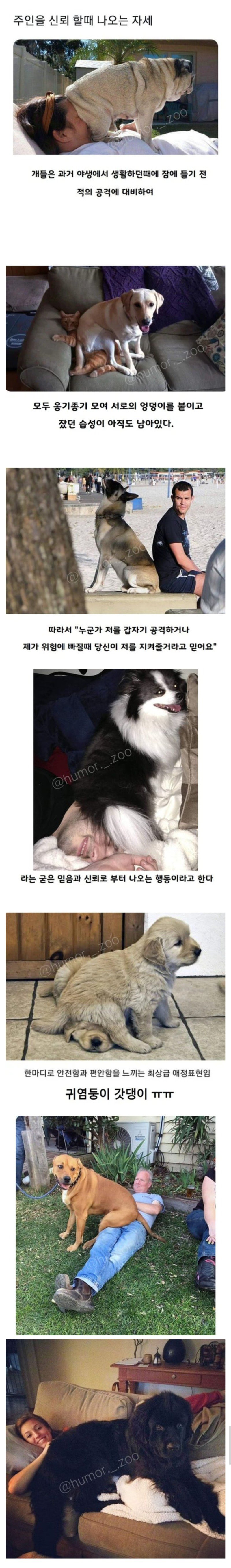 개들은 과거 야생에서 생활하던 때에 잠에 들기 전 적의 공격에 대비하여 모여 서로의 엉덩이를 붙이고 잤던 습성이 남아있다. 이러한 습성은 주인에 대한 신뢰와 함께 나타난다. 때문에 개들은 "누군가 저를 갑자기 공격하거나 위험에 빠질 때 당신이 저를 지켜줄거라고 믿어요"라는 강한 신뢰와 믿음으로 인해 안전함과 편안함을 느끼며 행동한다. 이 행동들은 주인에 대한 애정의 최상급 표현으로 귀염둥이로 불리기도 한다.